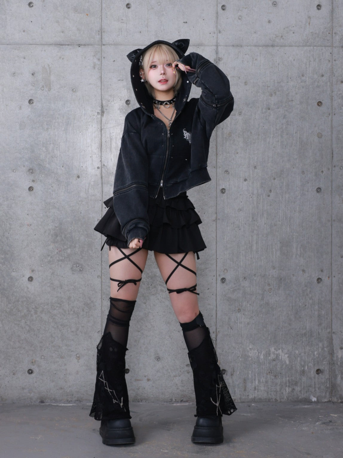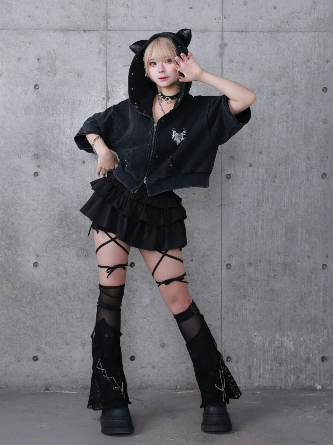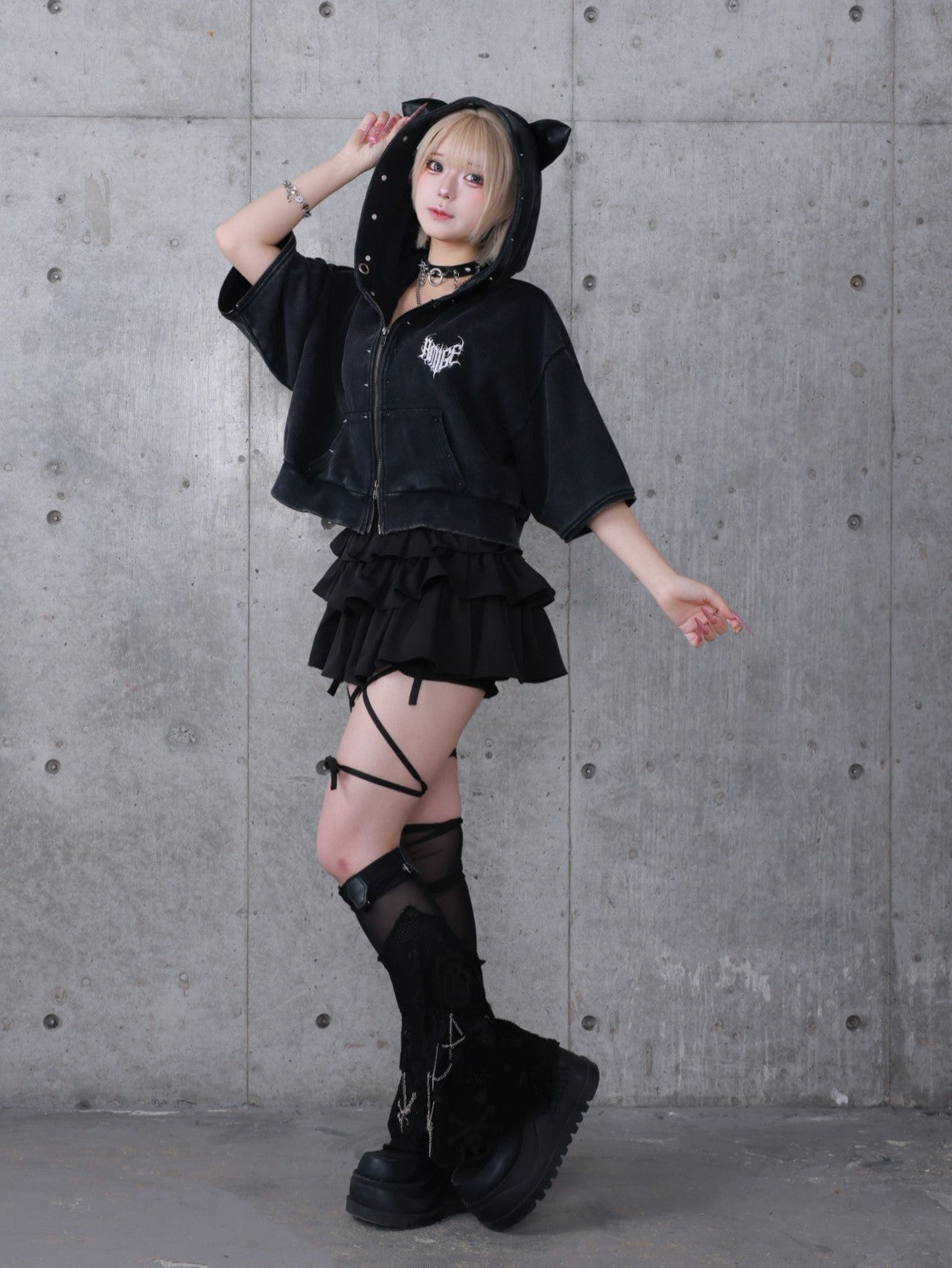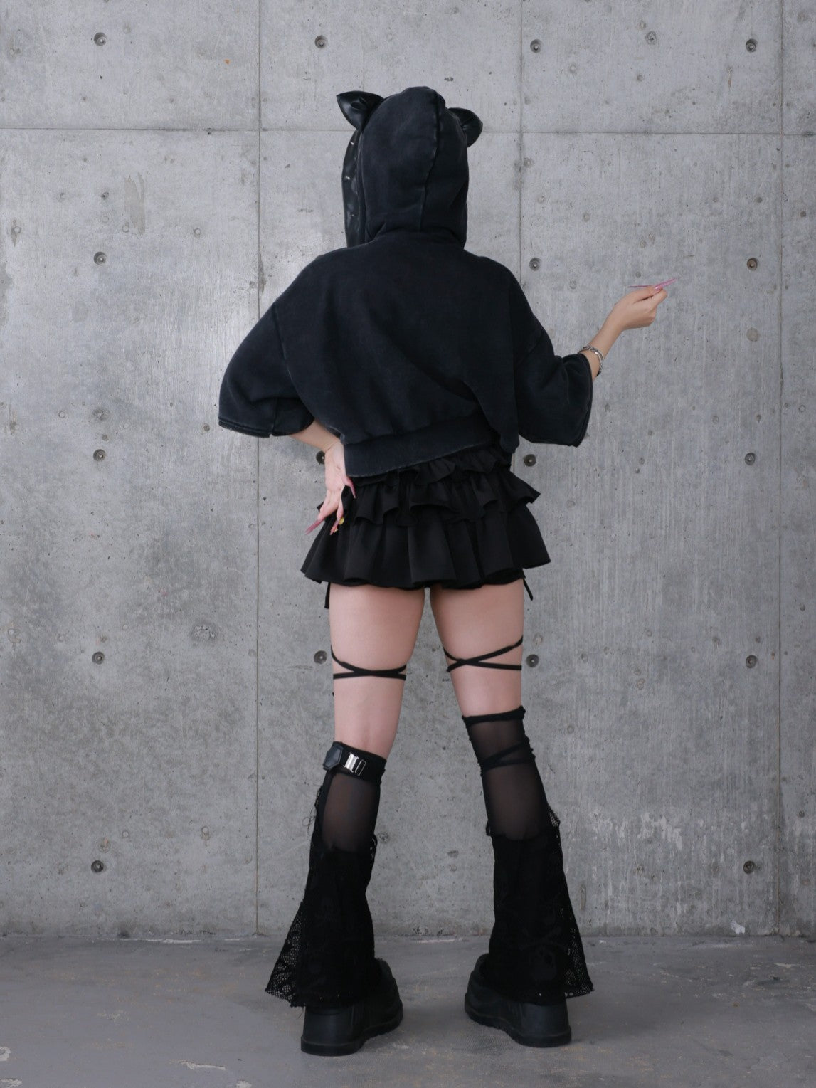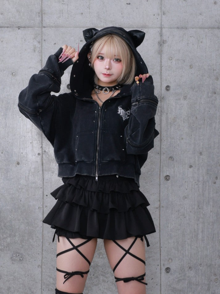 商品説明フードにPUレザーの猫耳デザインとスタッズが特徴的なショート丈パーカー。ウォッシュ加工を施したブラック/グレーの2色展開で、