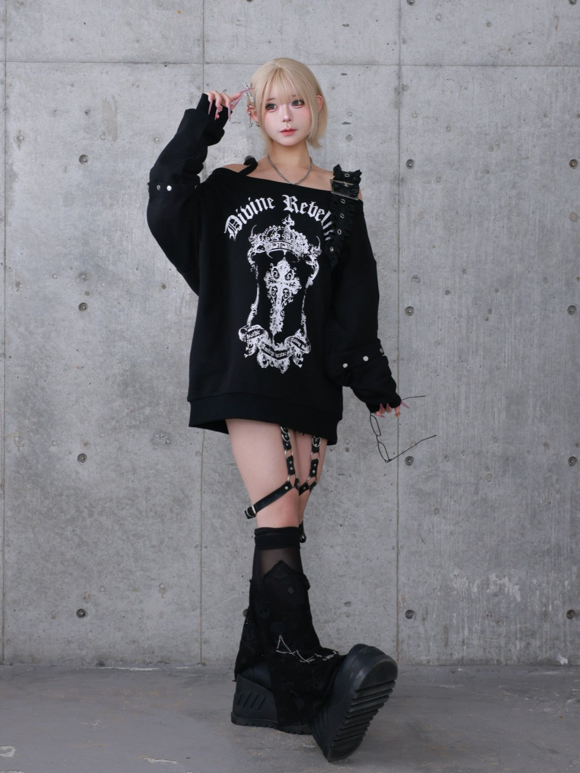 クロスモチーフの大型グラフィックひび割れ風プリントで奥行きのある表情右肩バックルストラップがアクセントセパレート風スリーブ+スナップ金具ゆとりのあるシルエットで着用しやすい▷STYLING