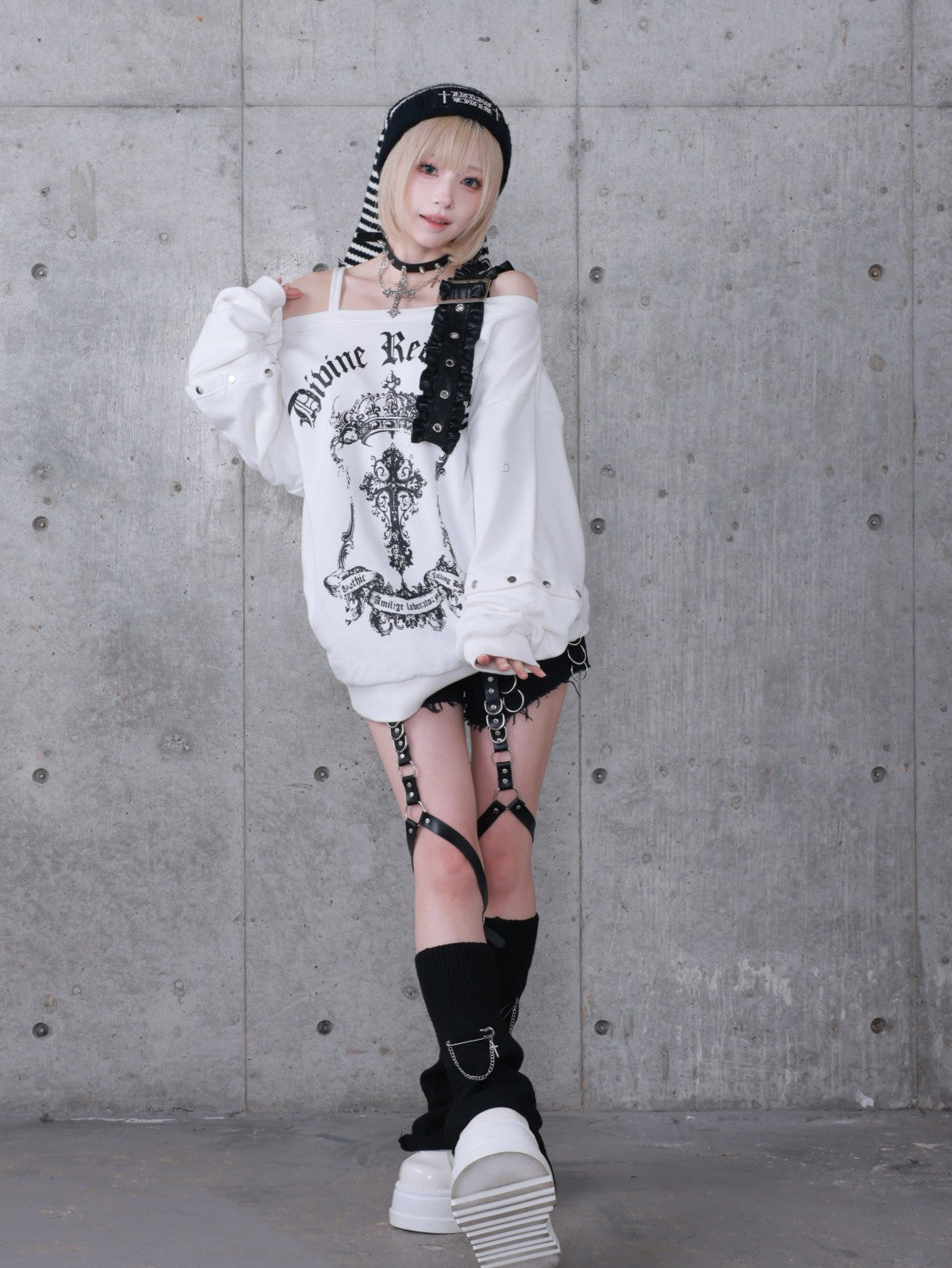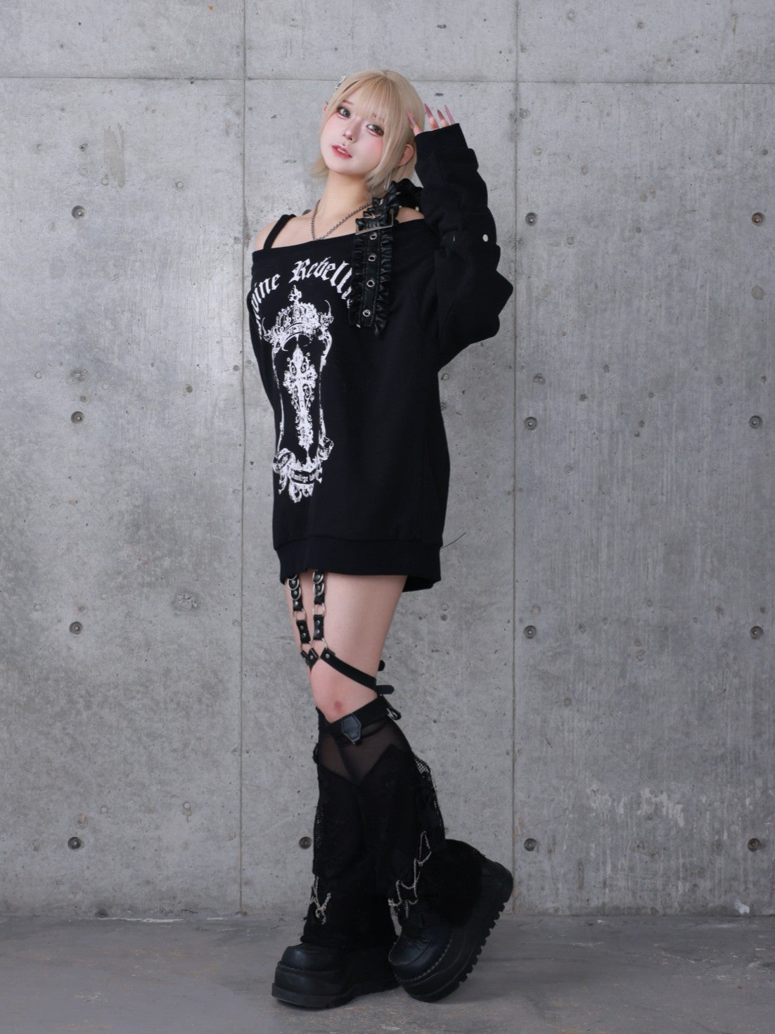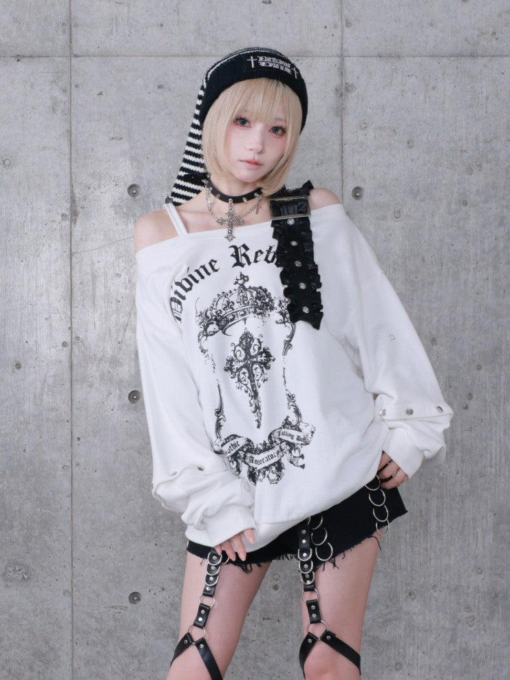 商品説明オフショルデザインにクロスモチーフの