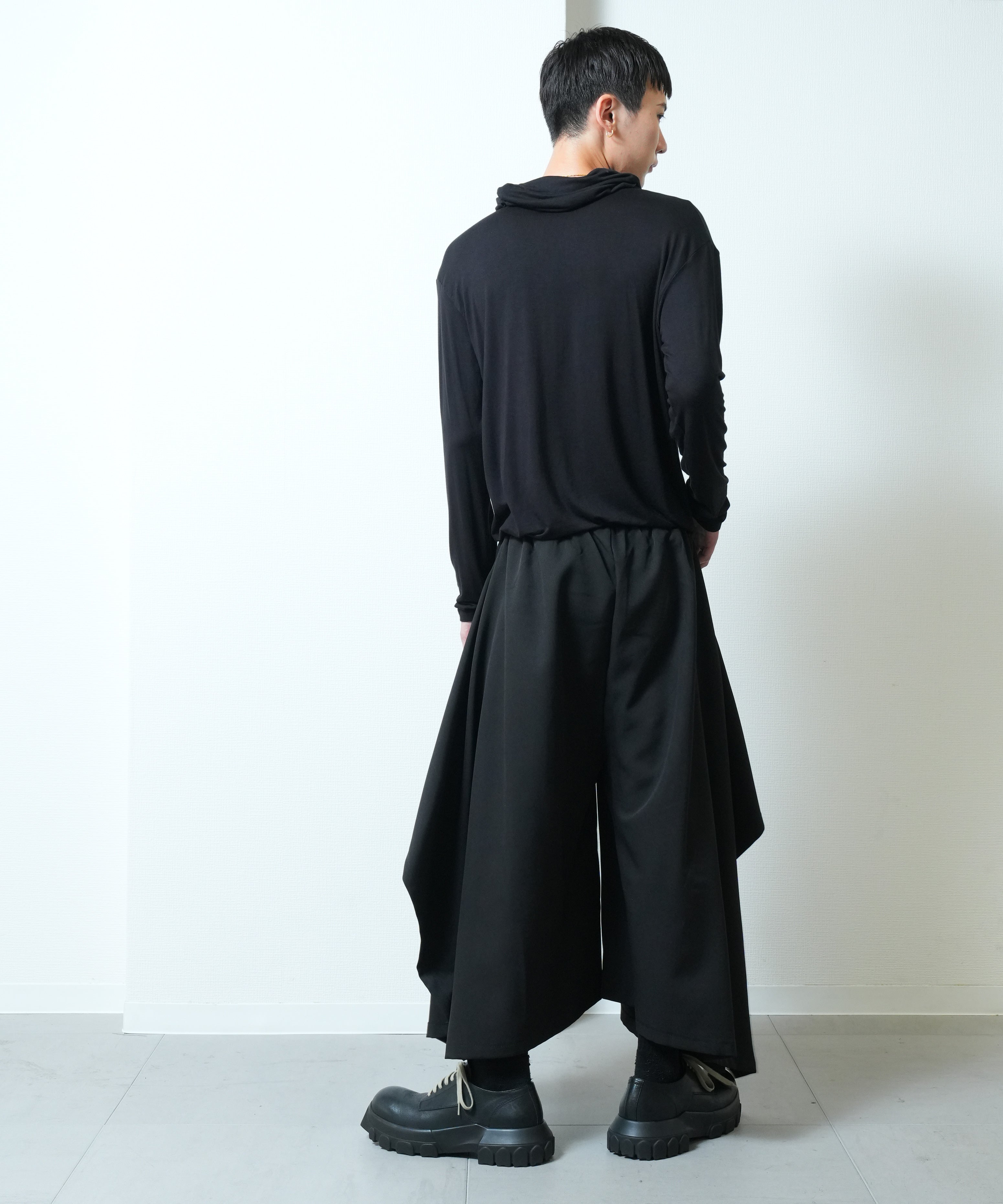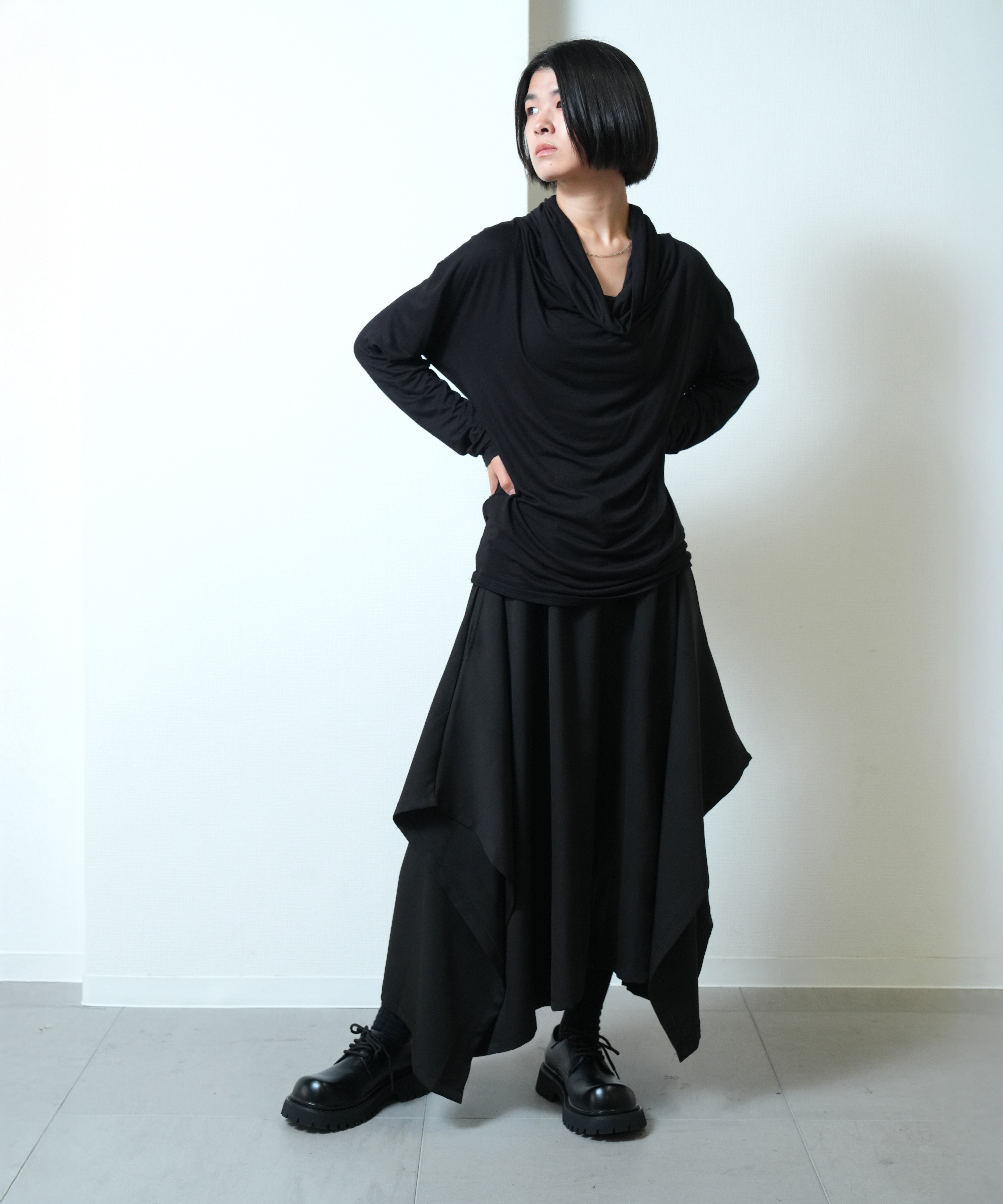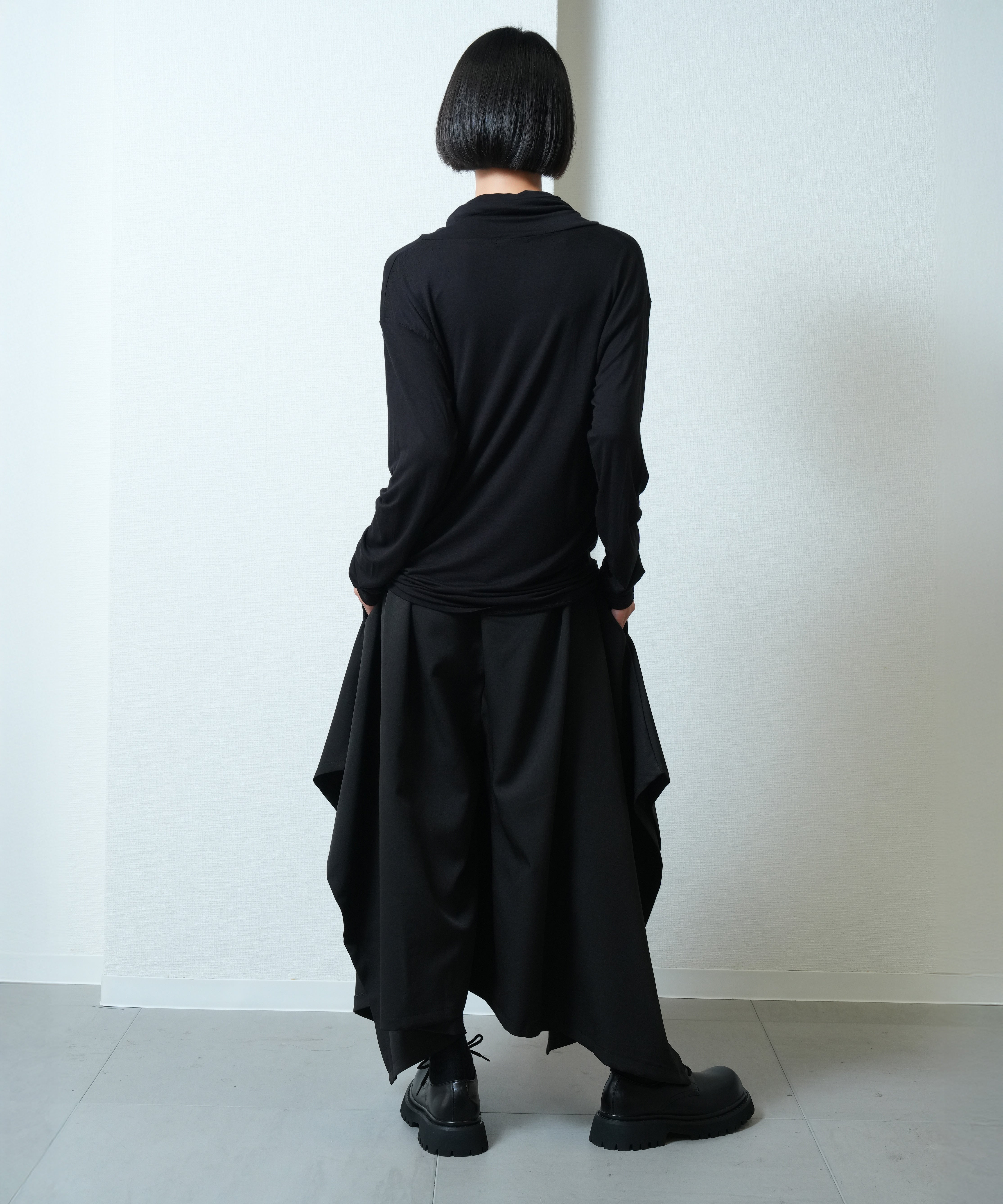 シンプルなスクエアカットのパターン複雑な装飾を排し、布が本来持つしなやかさや落ち感を最大限に引き出すことで他に類を見ない美しいドレープが生まれます。