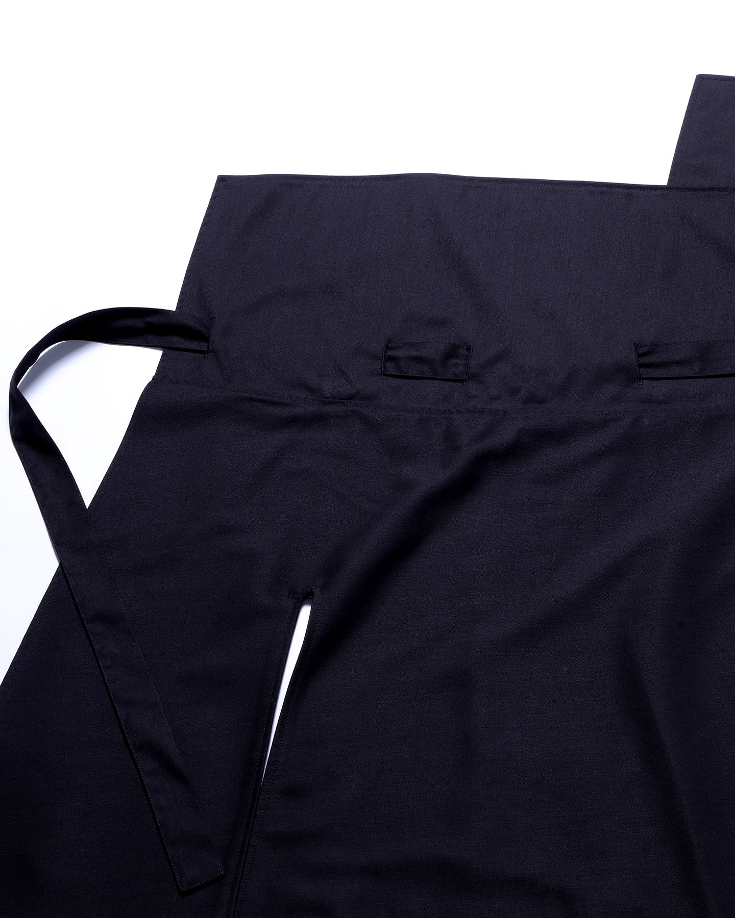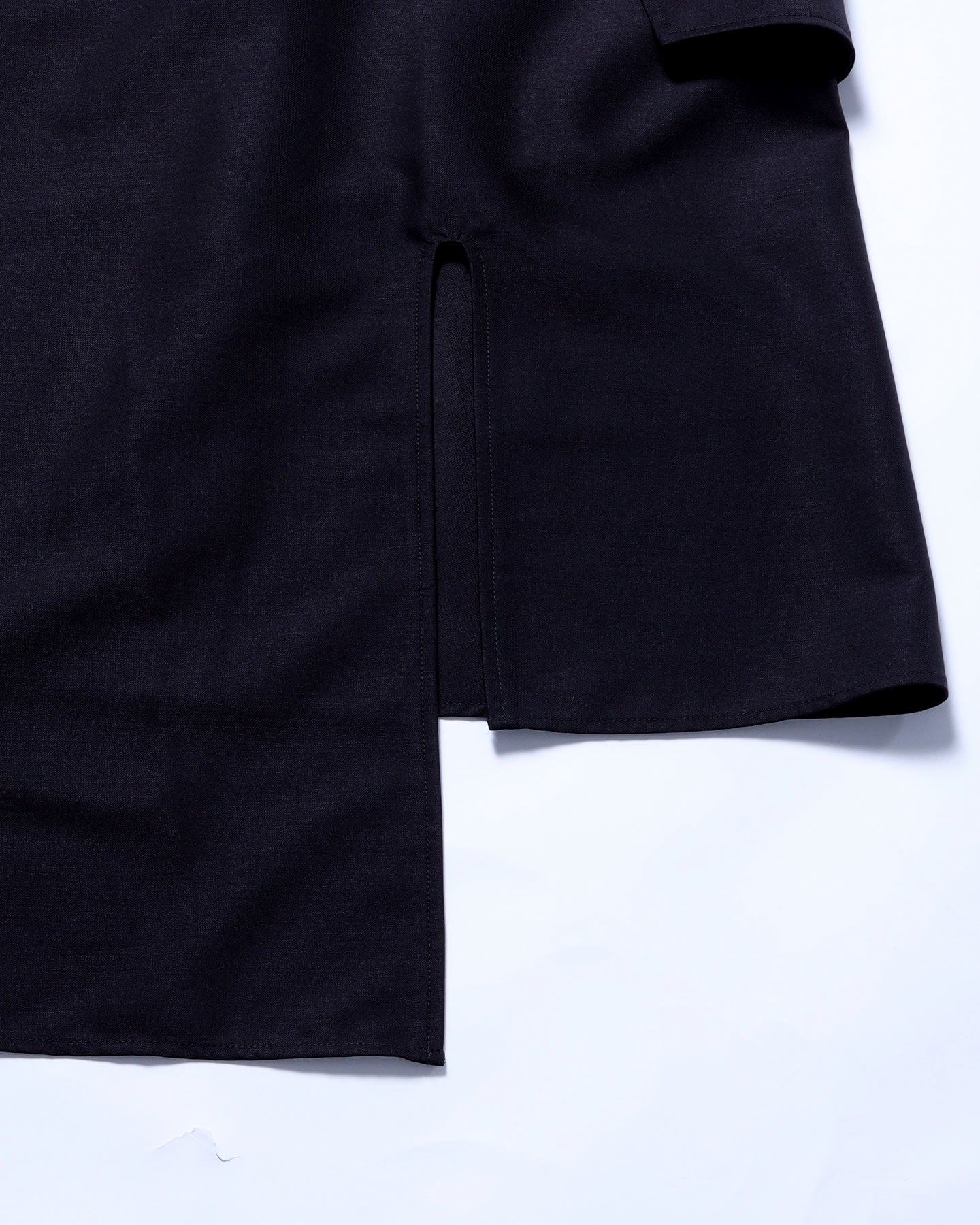 四方どの角度からもアシンメトリーな構造とウエスト部分の折り返しのフラップによって奥行きのある仕様に、さらに各所の深く開いたスリットはポケットへのアクセスを向上させる。