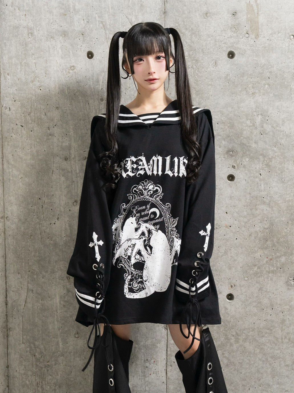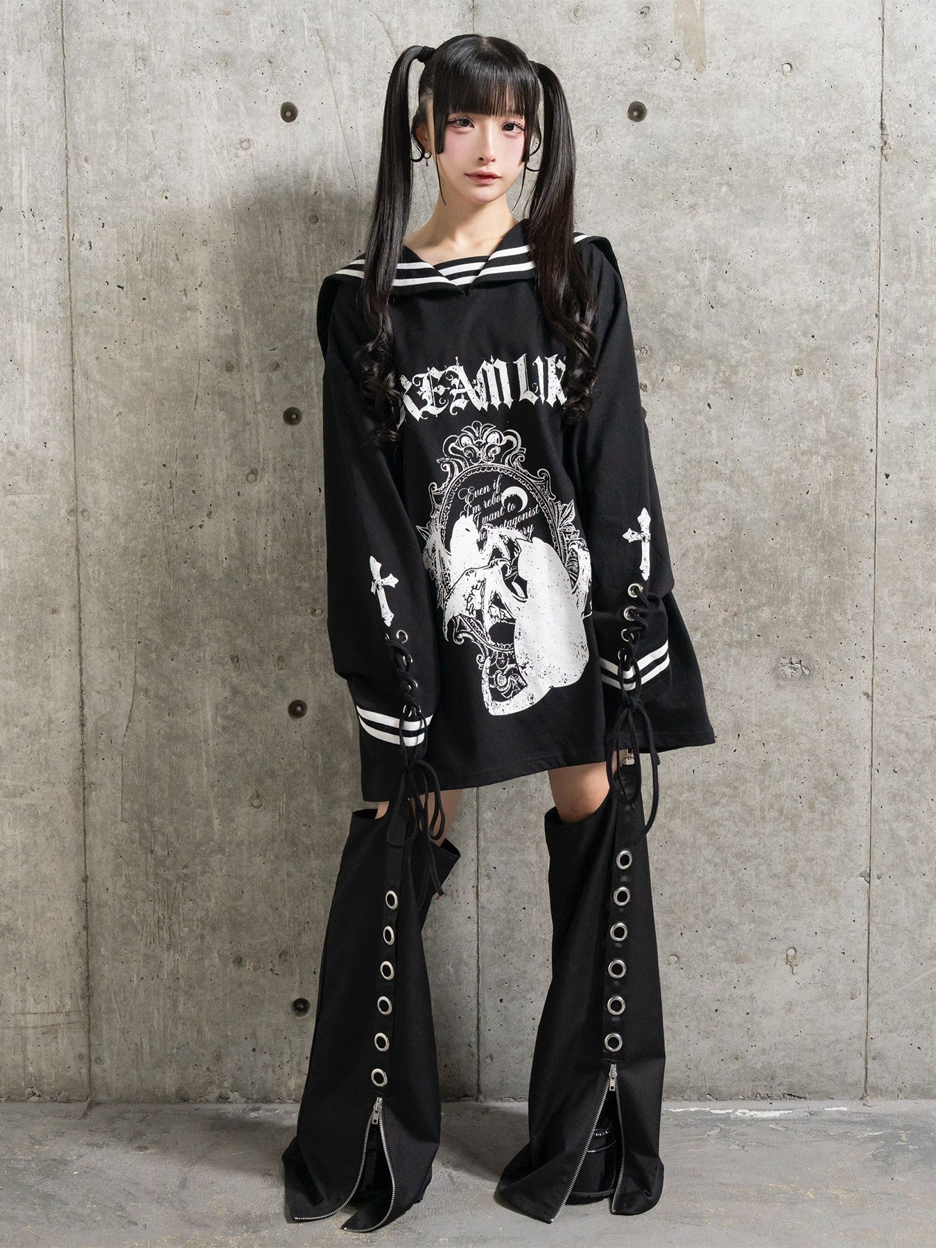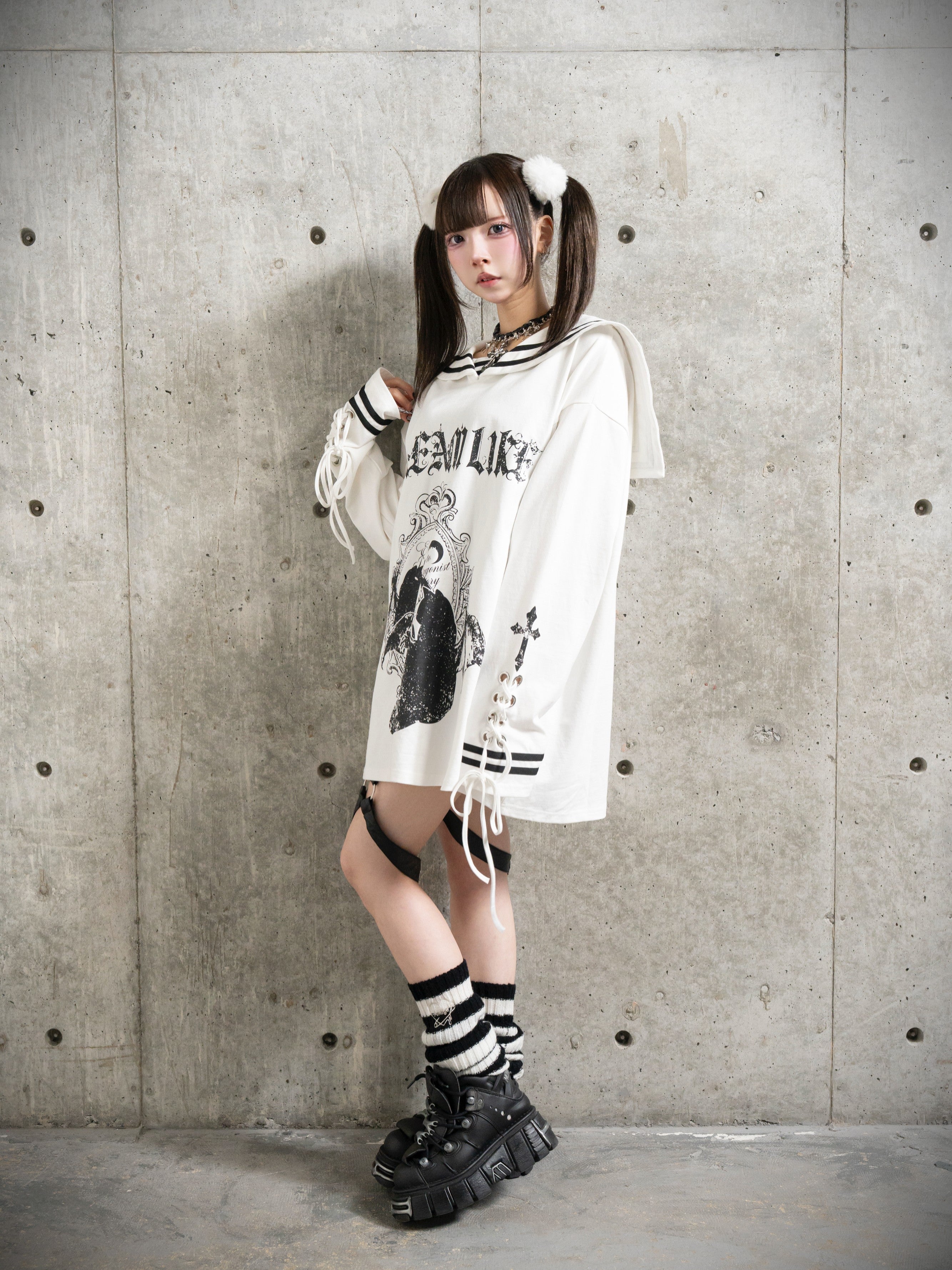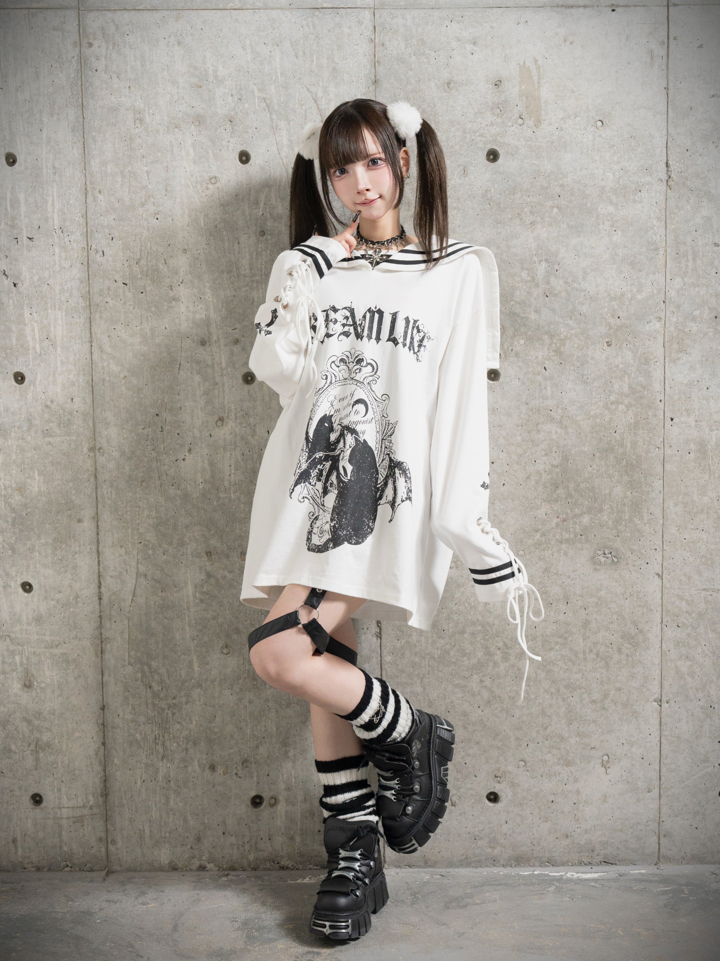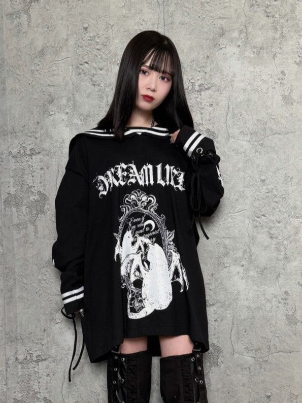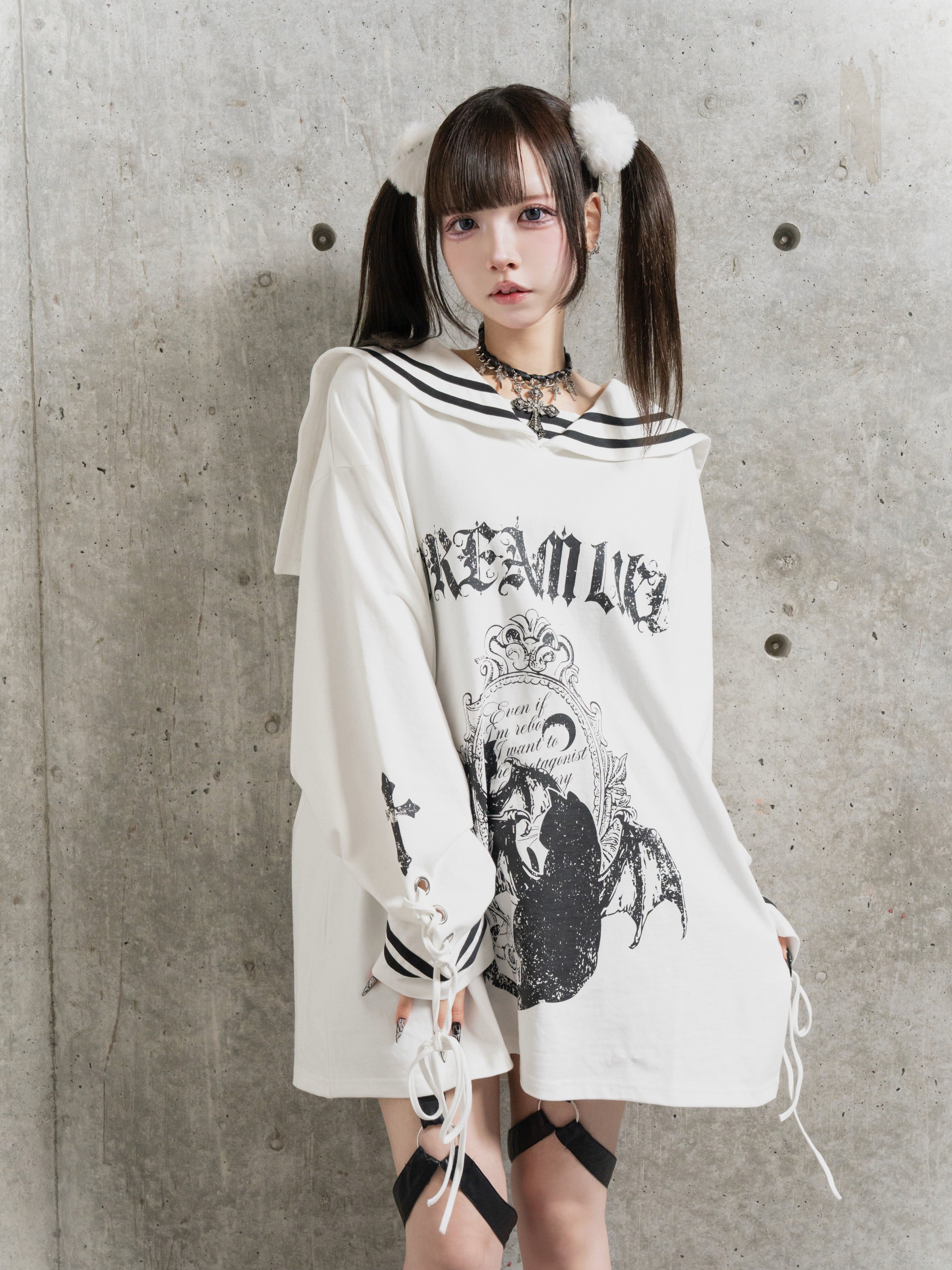 デザインと組み合わせてプリントし、印象的なビジュアルに仕上げています。セーラー襟のラインデザインと、袖に施したレースアップリボンが程よい甘さをプラス。ダークトーンのグラフィックとガーリーなディテールのバランスが特徴です。ゆったりとしたシルエットで、スカート・パンツどちらにも合わせやすく、
