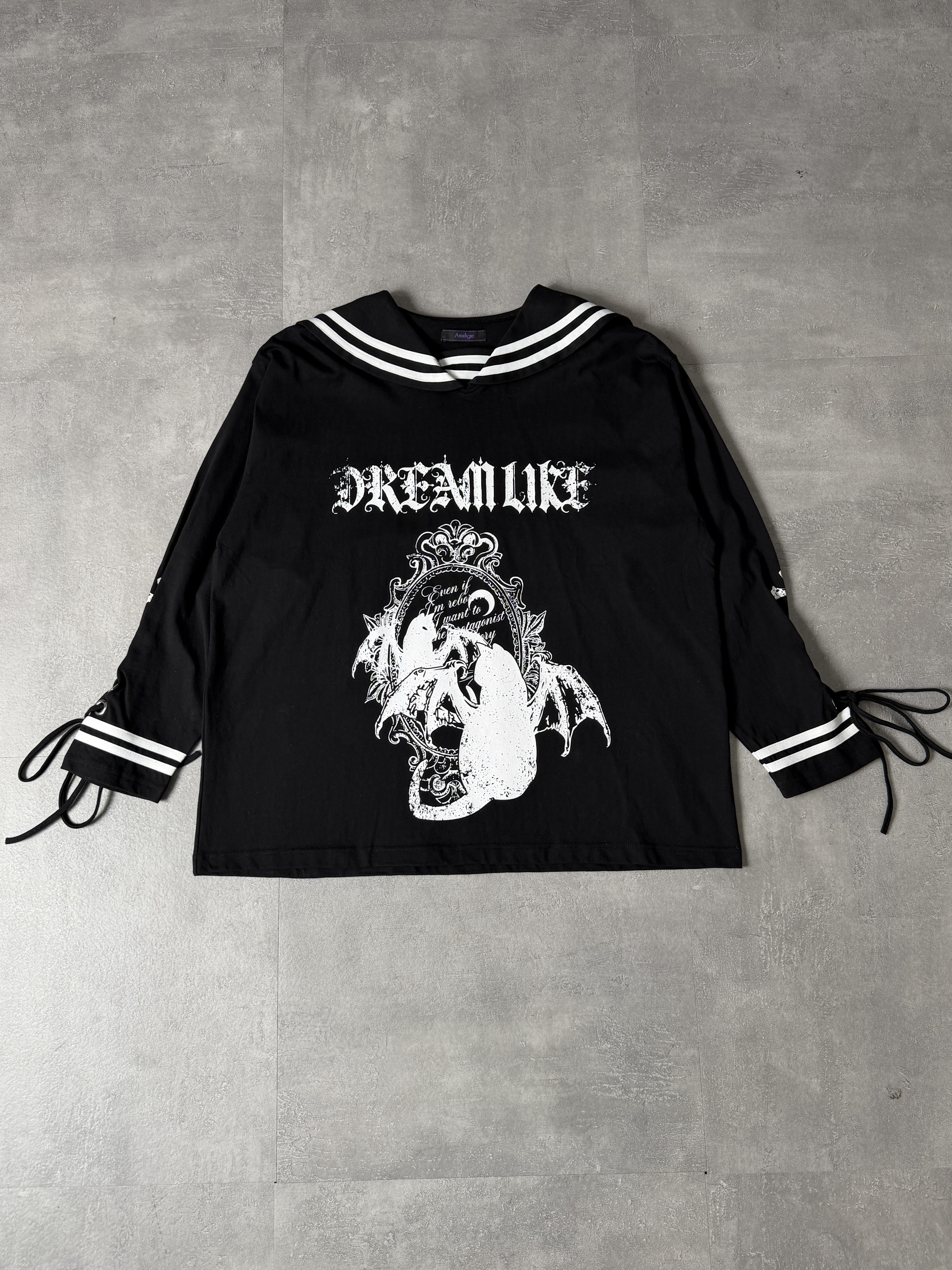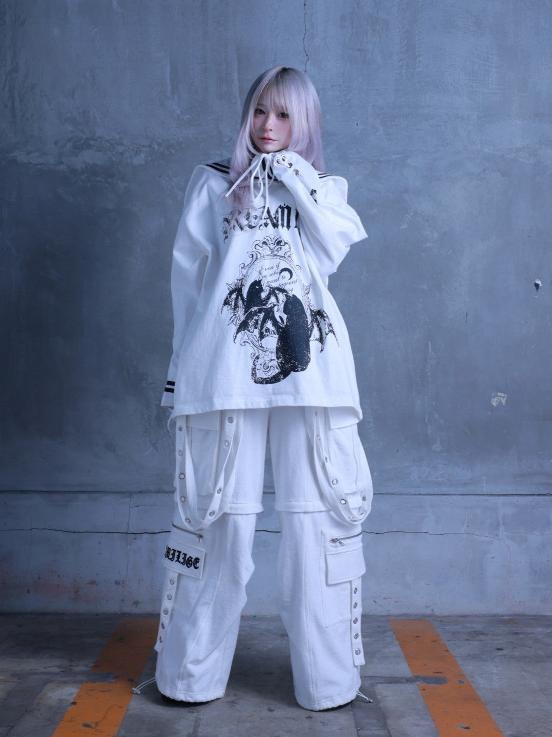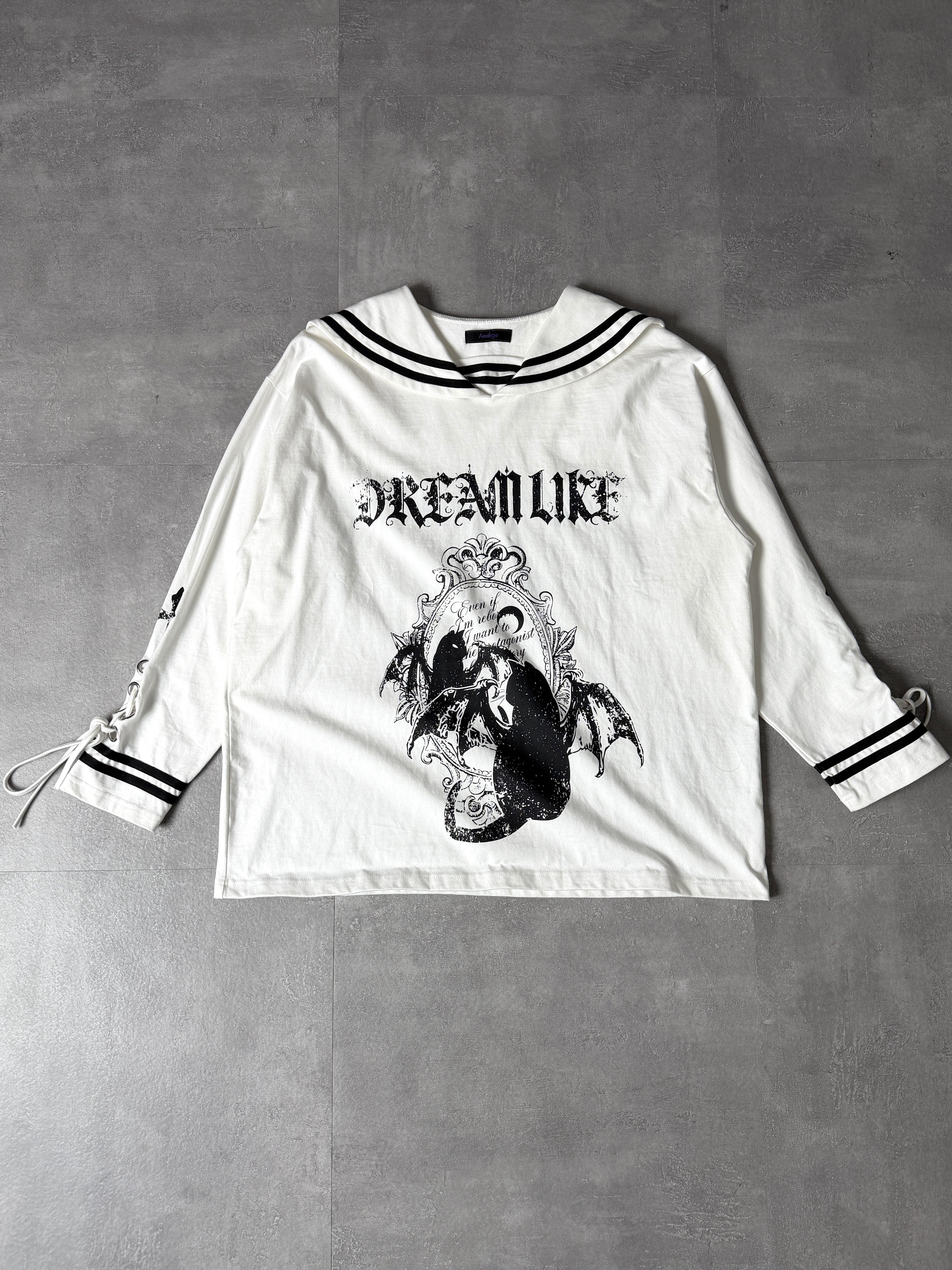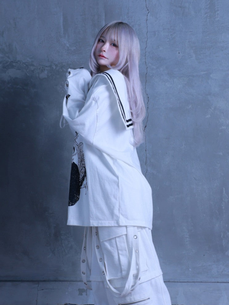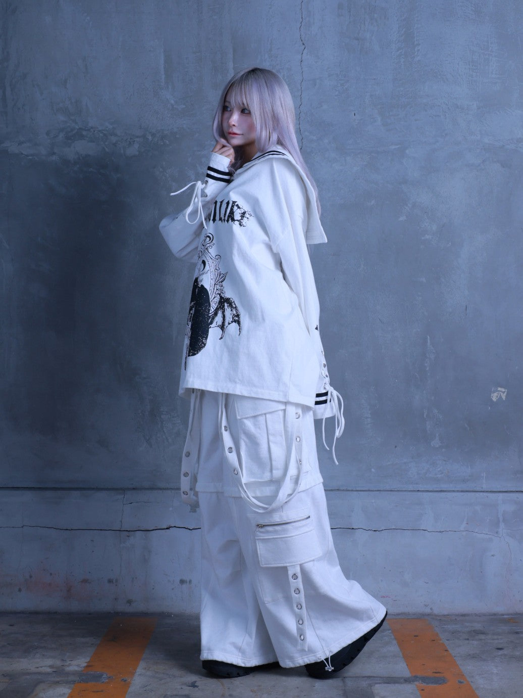 デザインと組み合わせてプリントし、印象的なビジュアルに仕上げています。セーラー襟のラインデザインと、袖に施したレースアップリボンが程よい甘さをプラス。ダークトーンのグラフィックとガーリーなディテールのバランスが特徴です。ゆったりとしたシルエットで、スカート・パンツどちらにも合わせやすく、