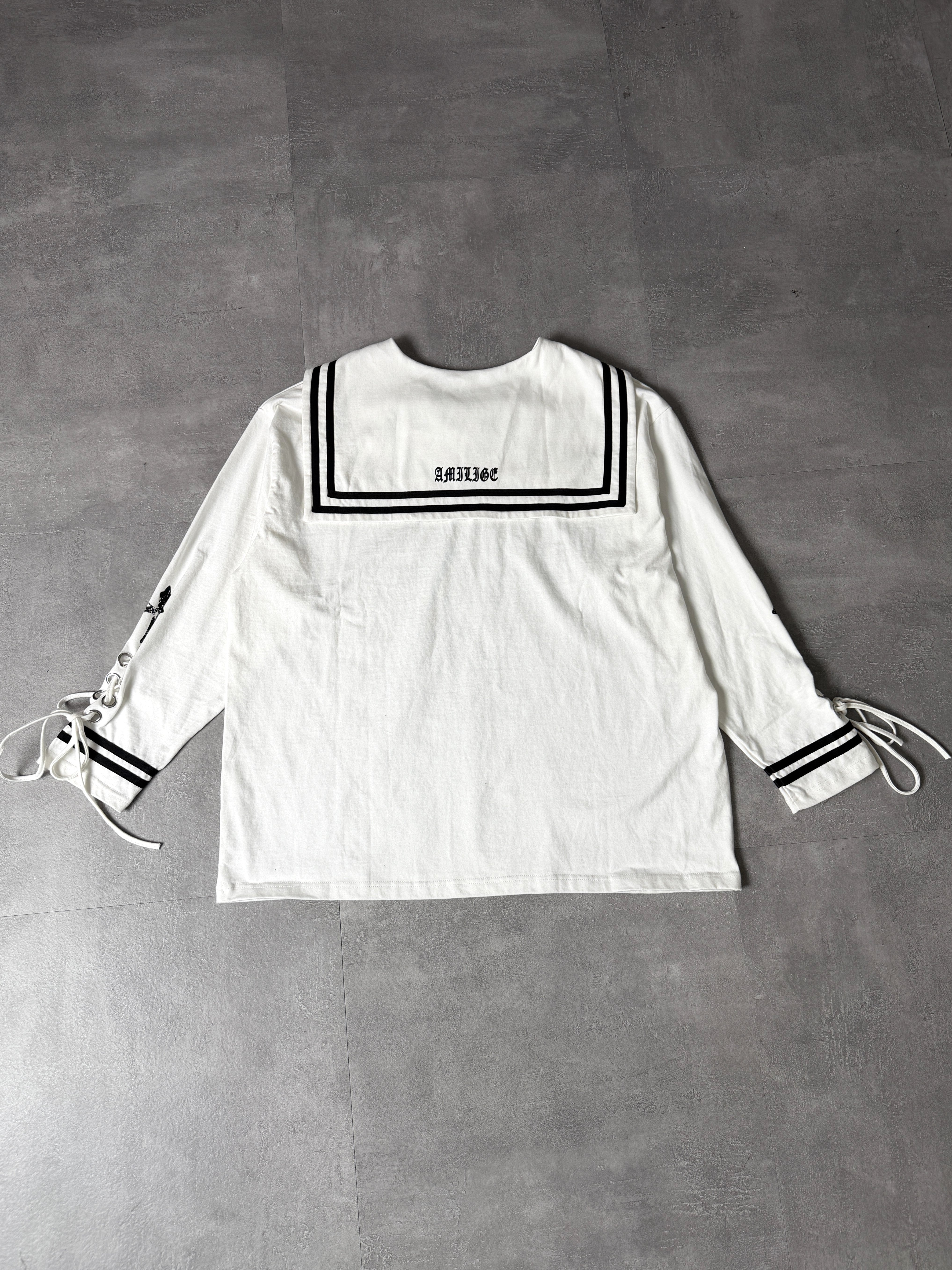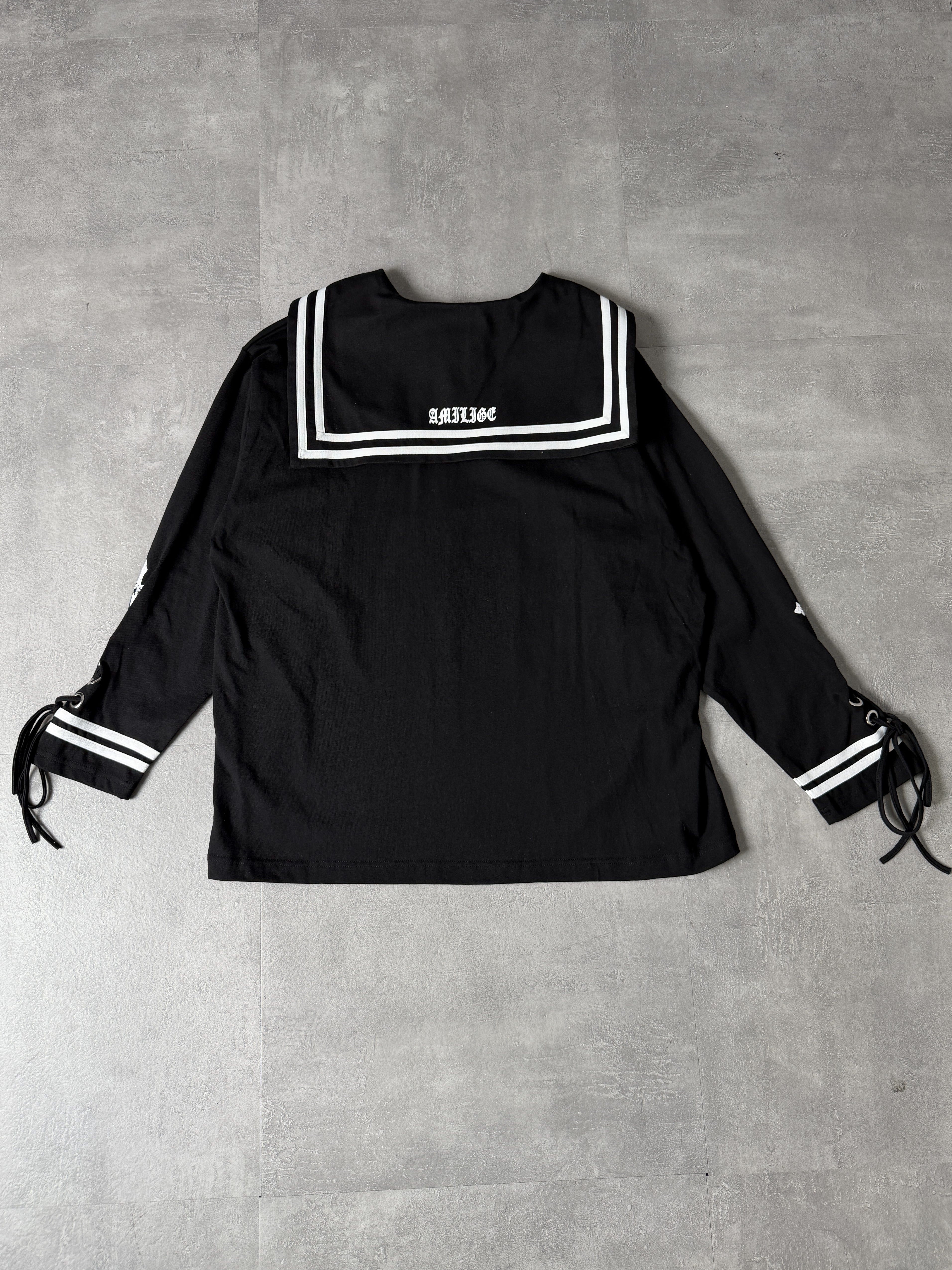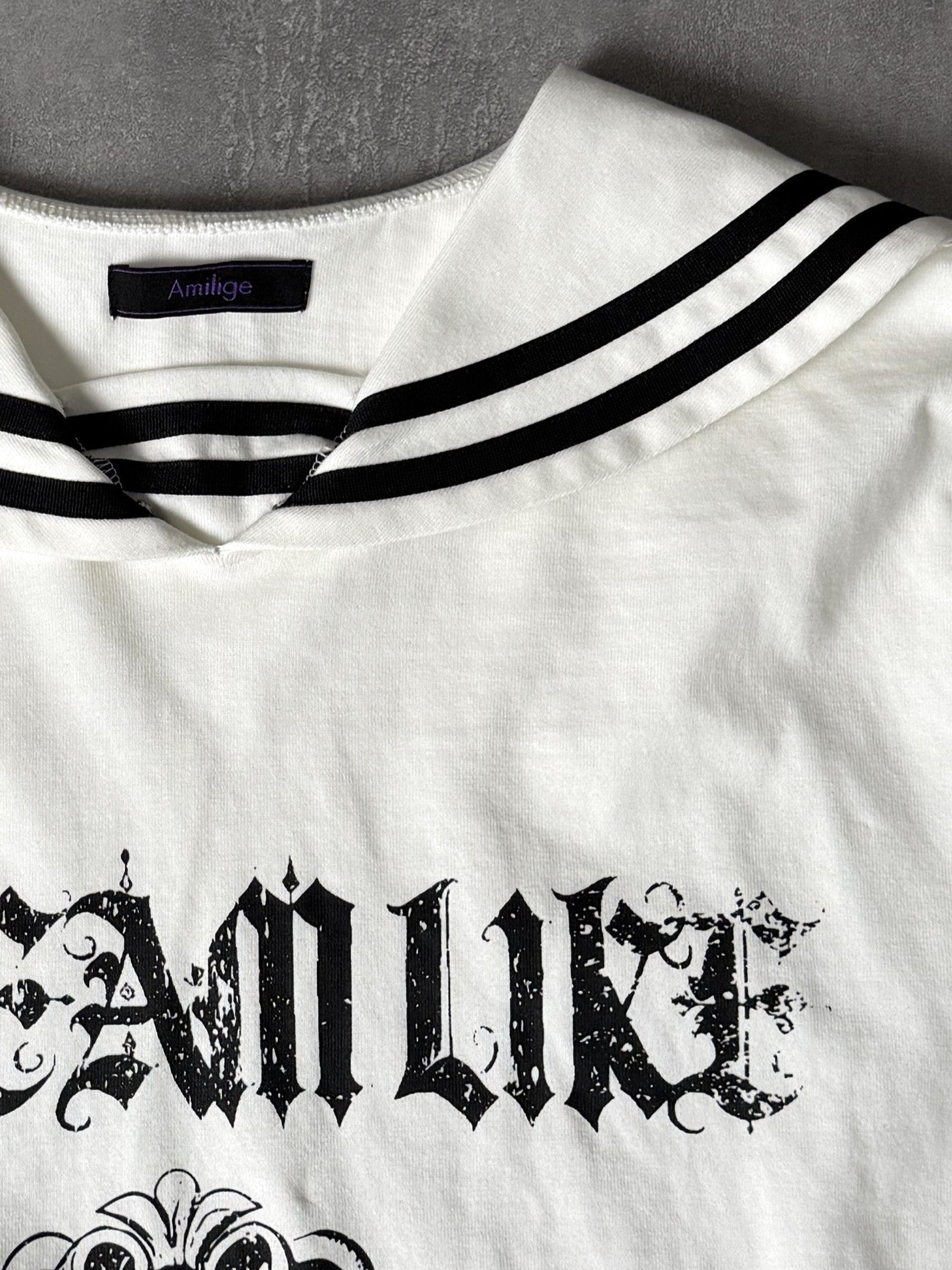 セーラーデザインにオリジナルプリントしたトップス。フロントには黒猫とウイングモチーフを、ミラーフレーム風の
