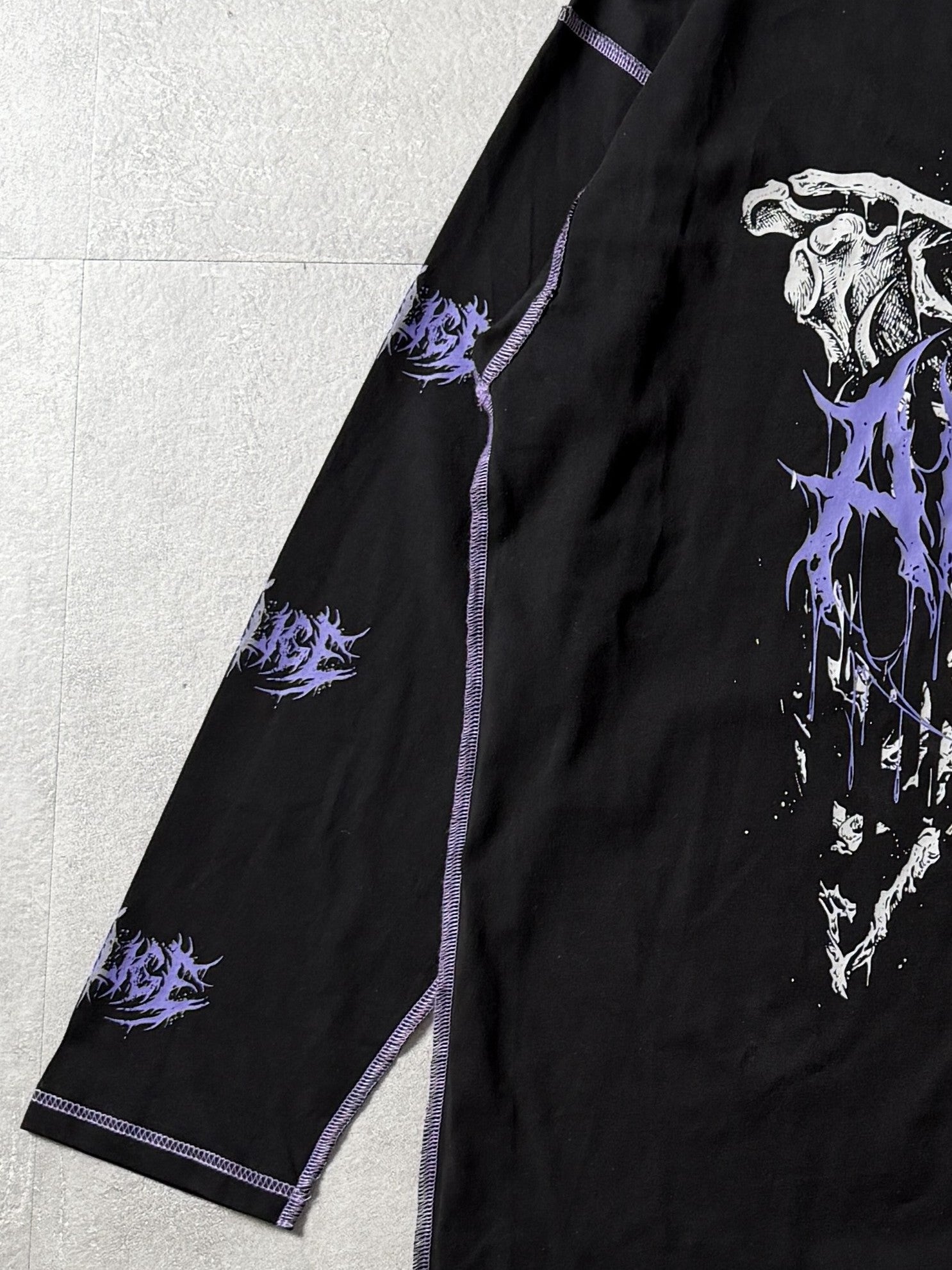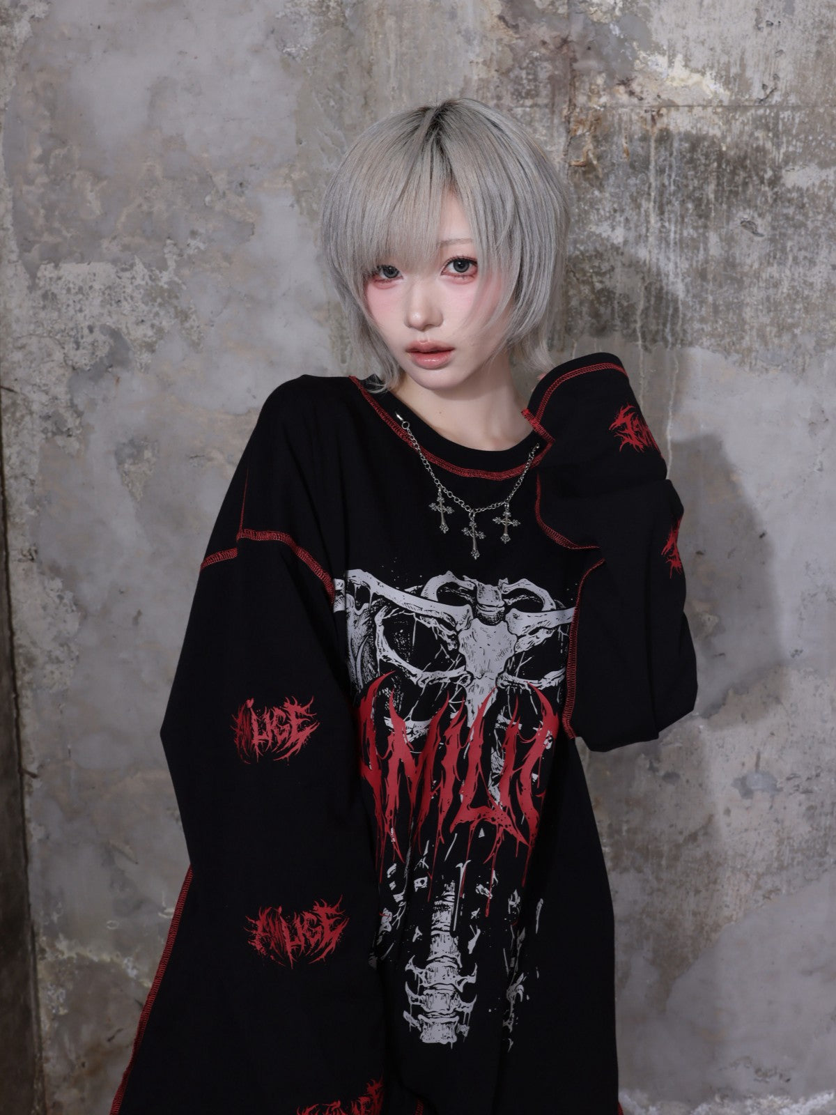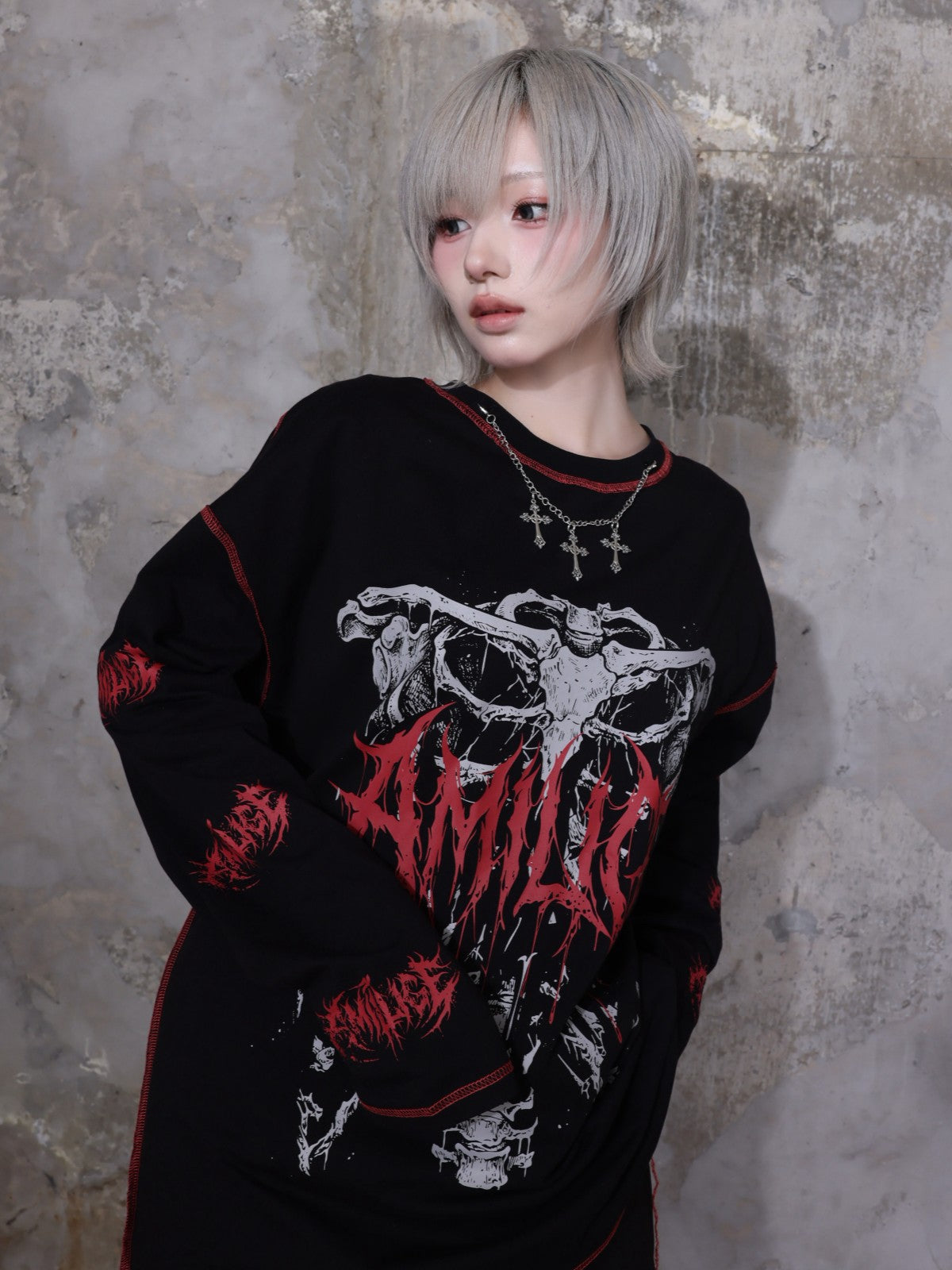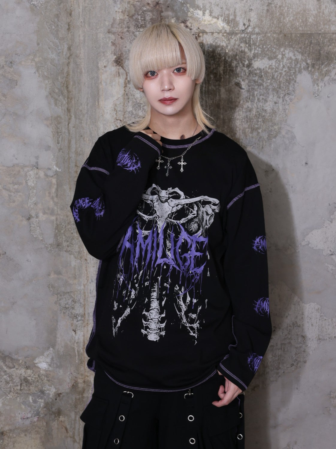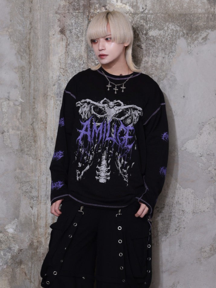 フロントの骨×袖ロゴプリントで強いビジュアルを演出