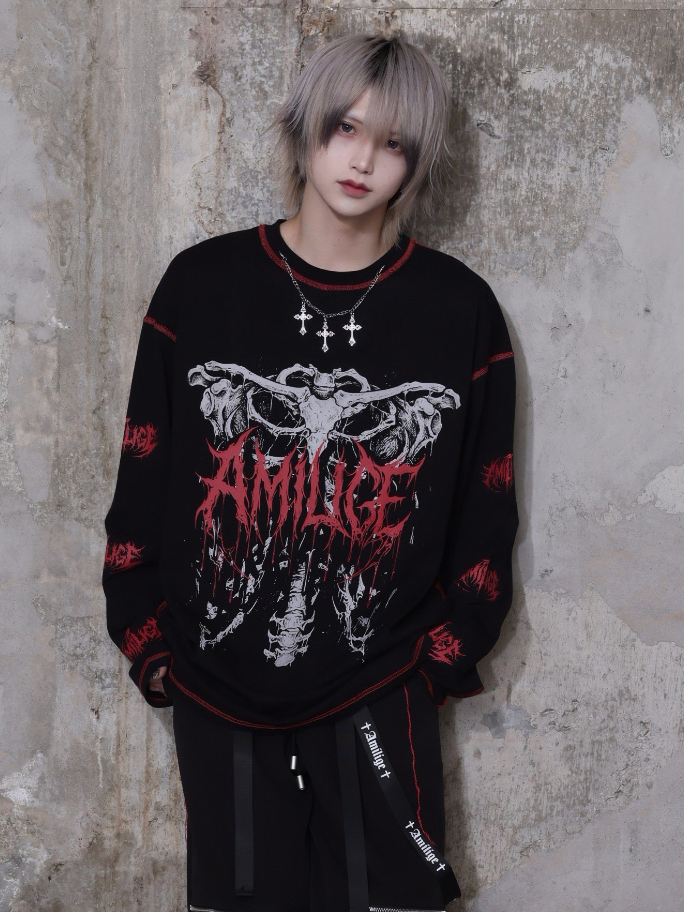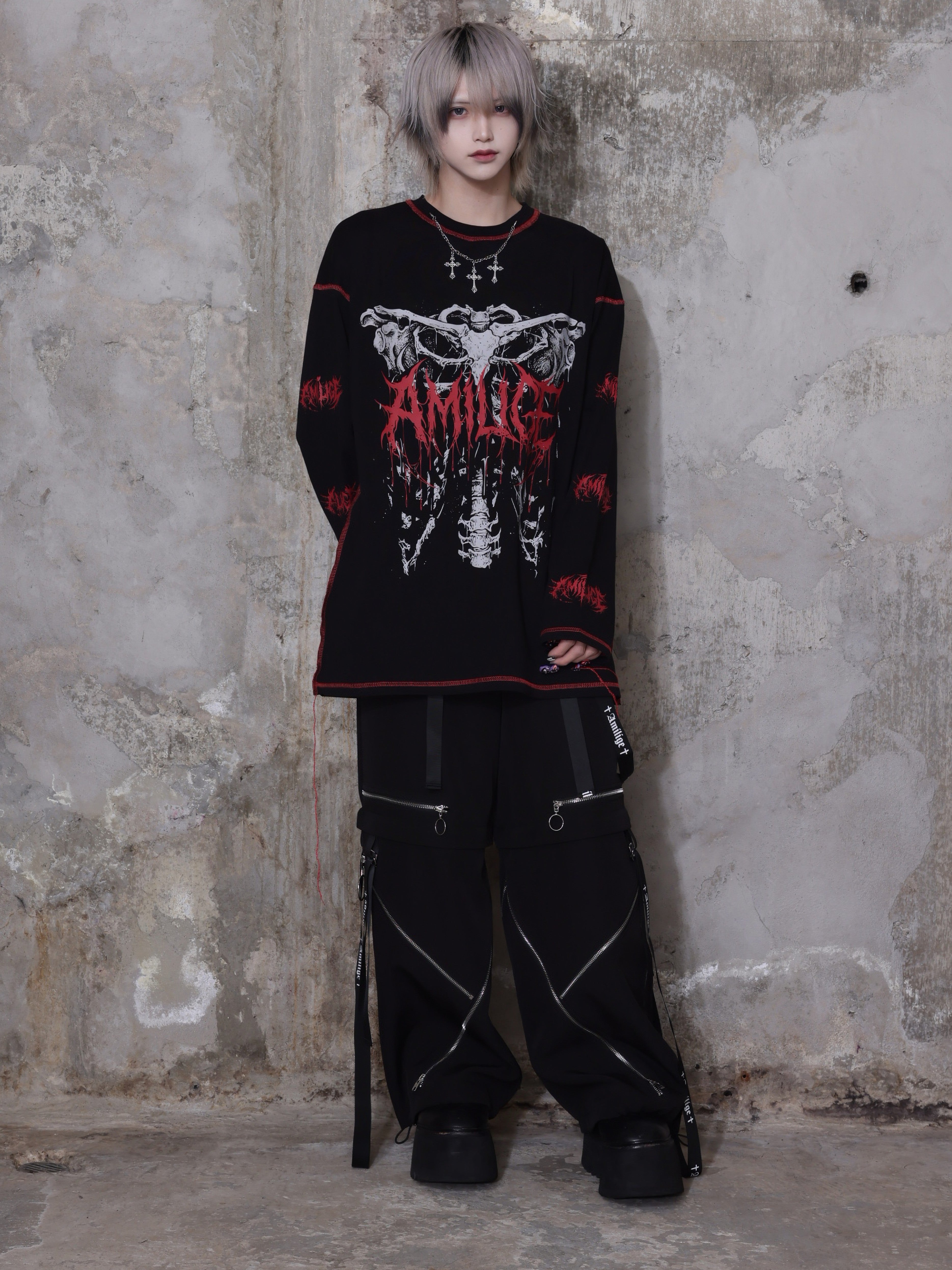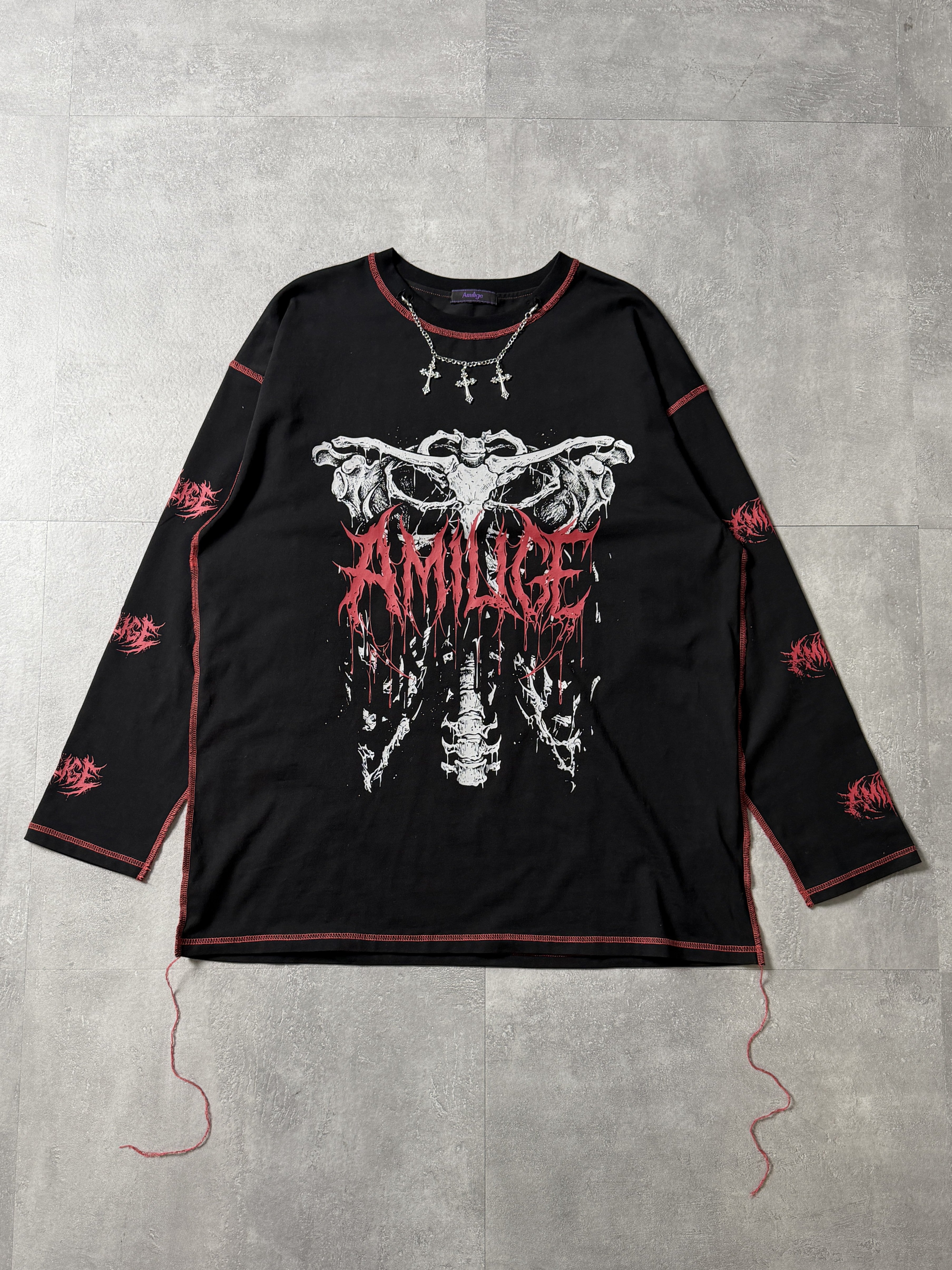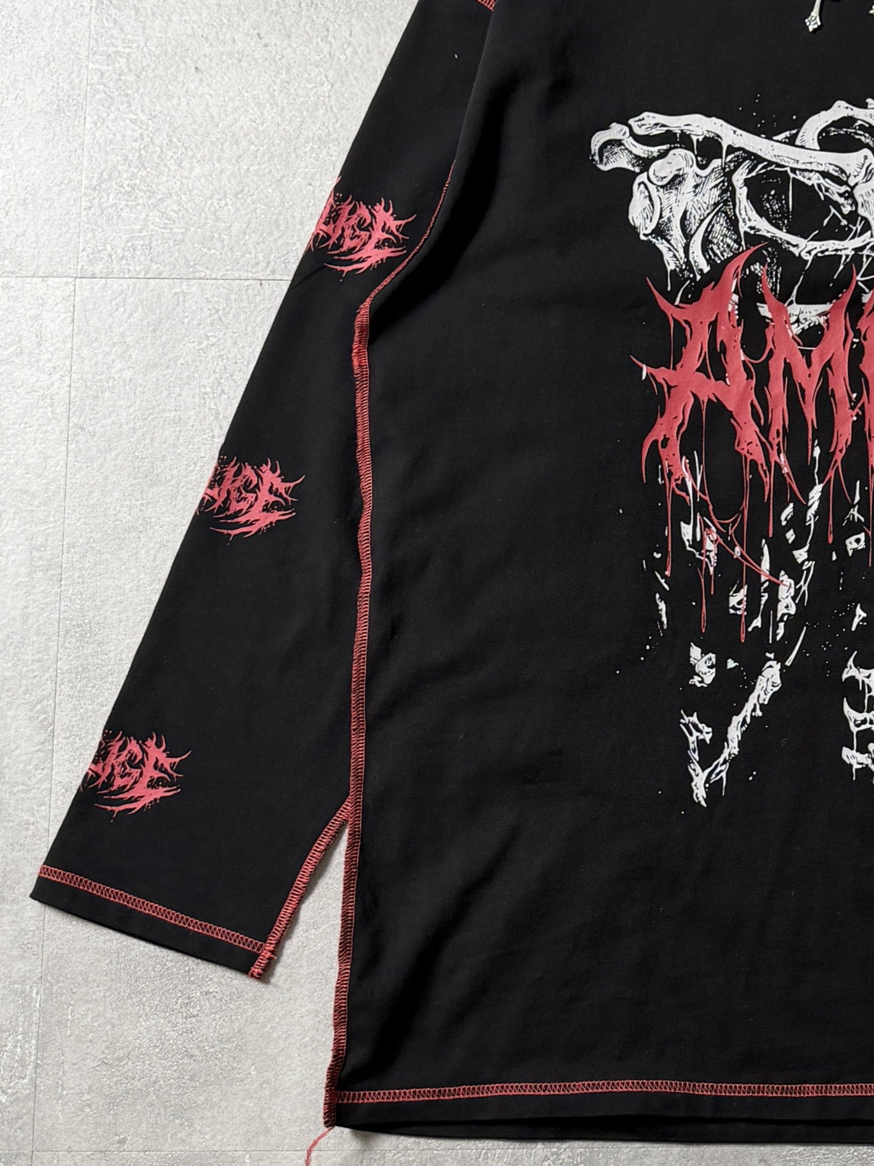 インパクトのある骨グラフィックとブランドロゴが目を引く、主役級ロングTシャツ。