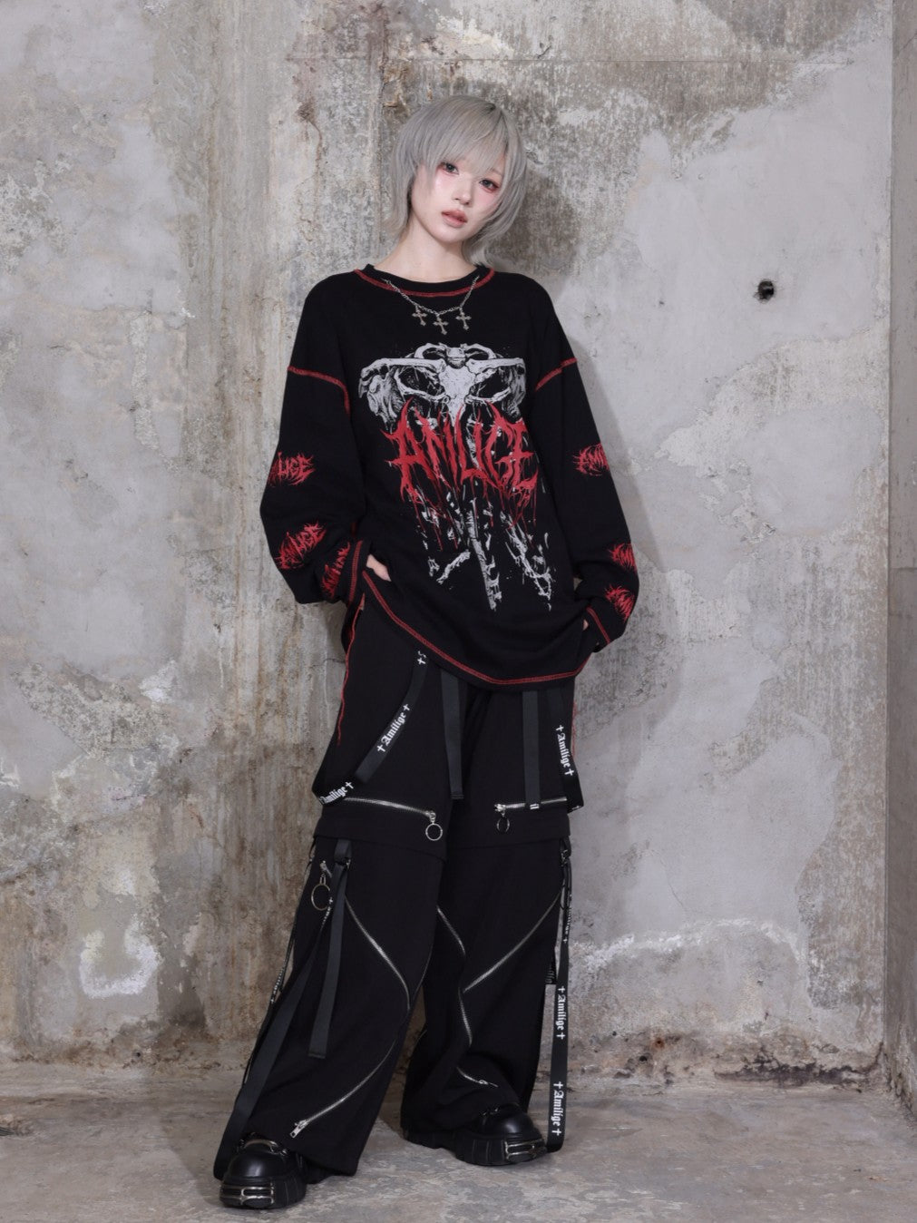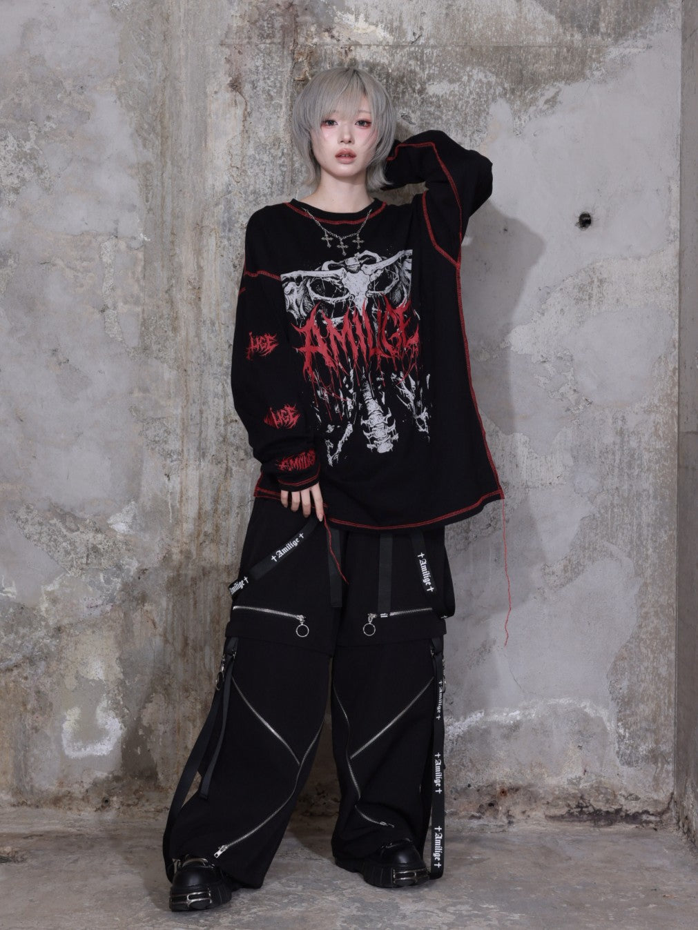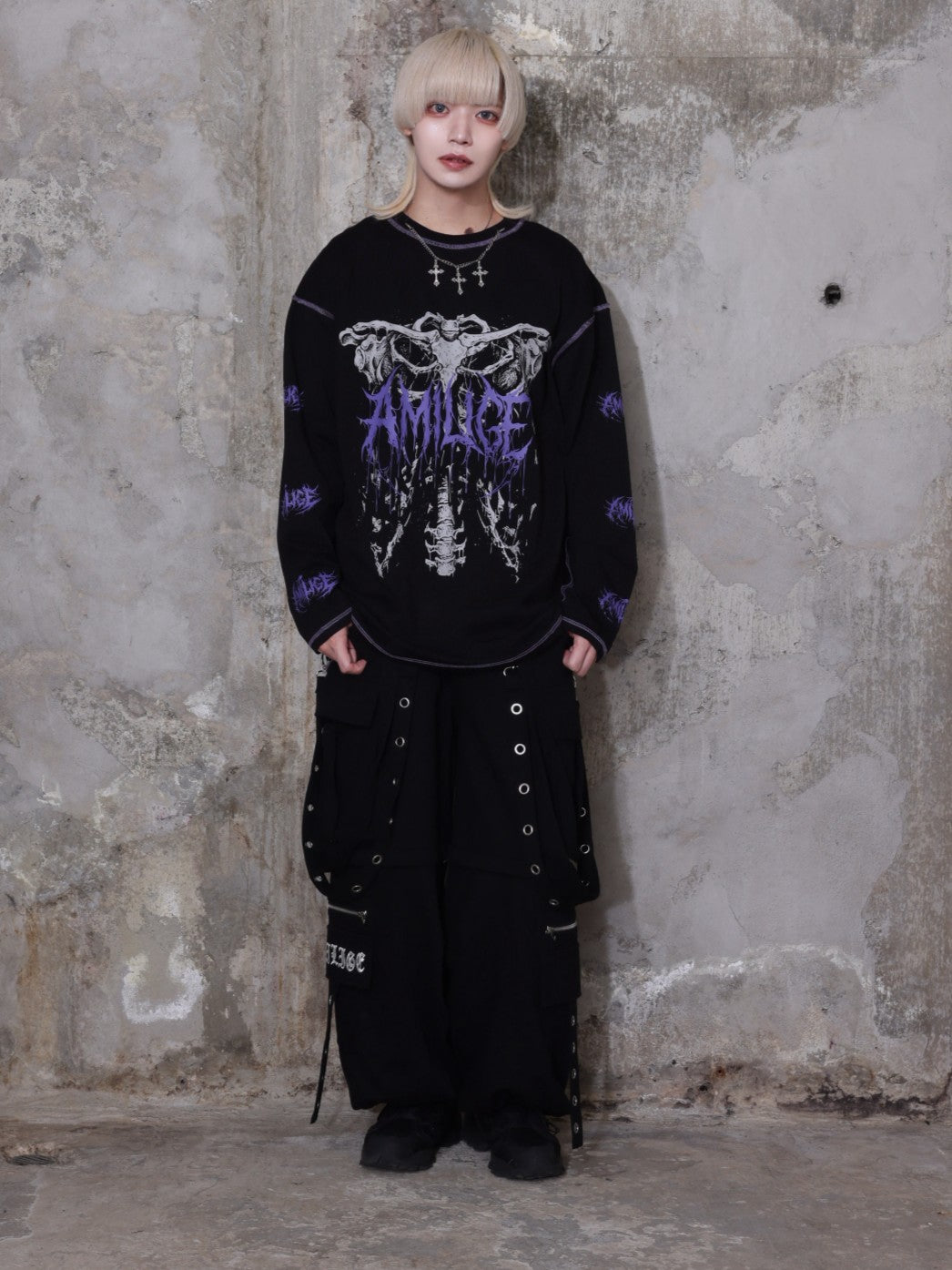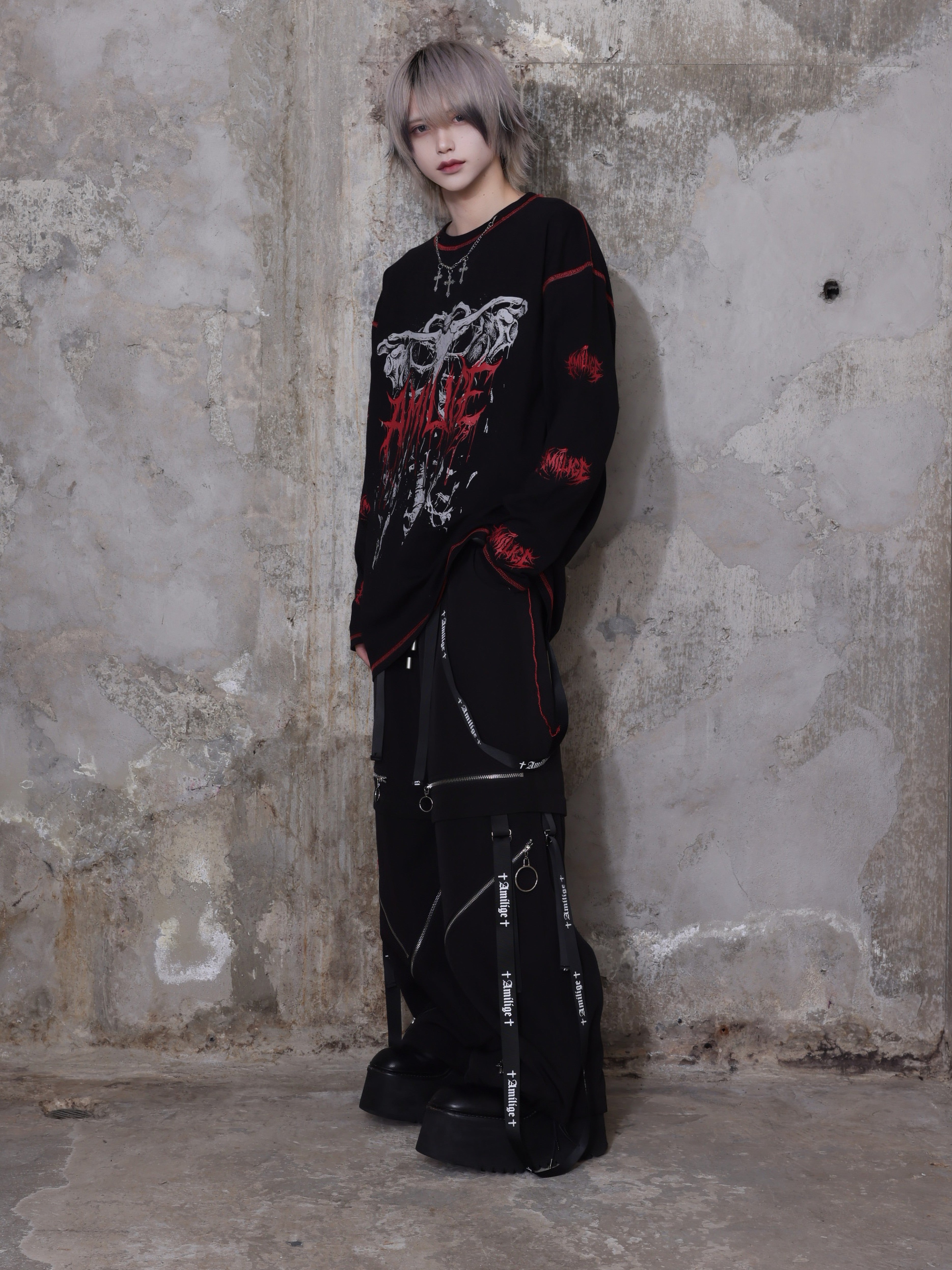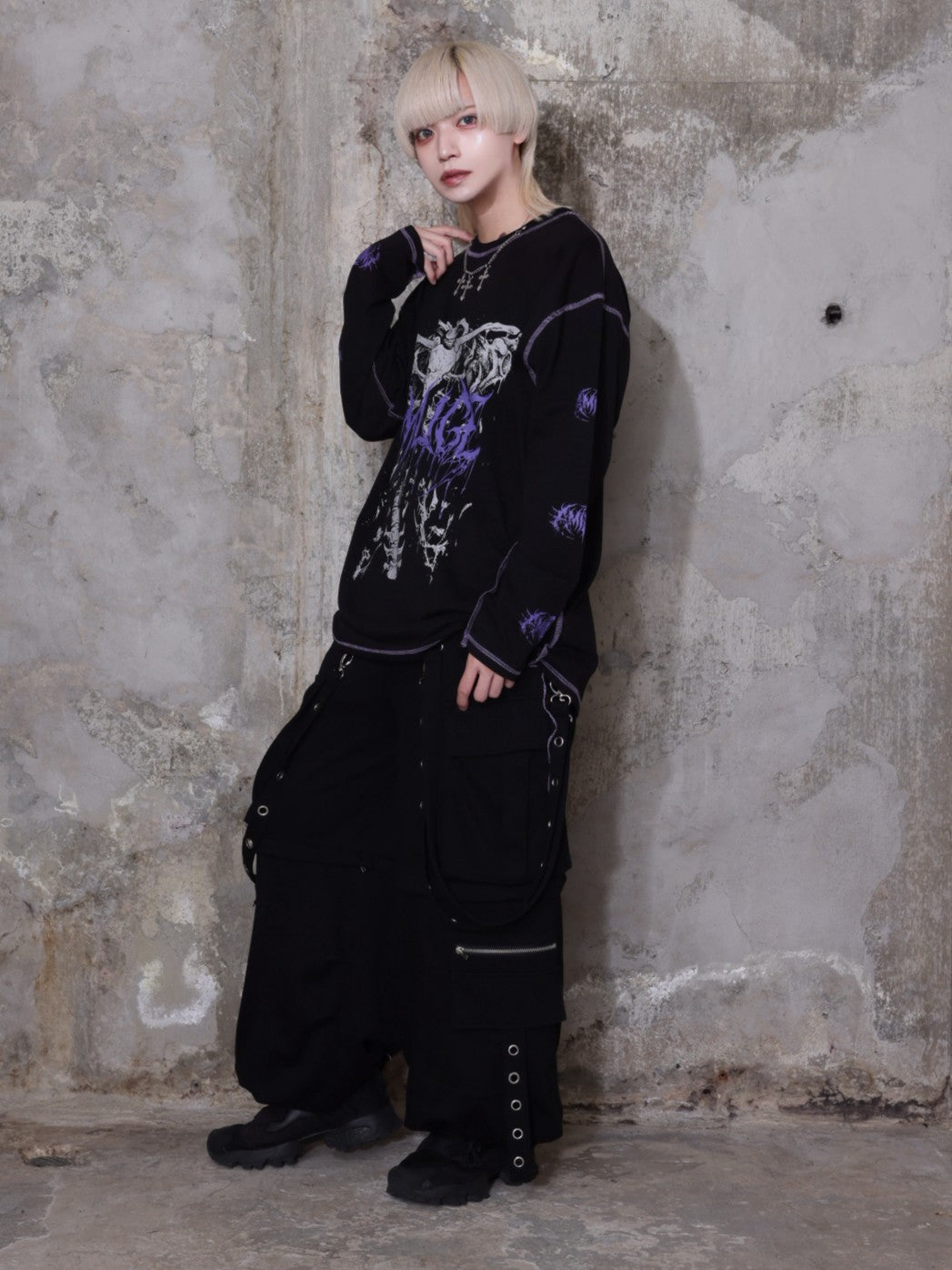 サスペンダー付きワイドパンツと合わせてサブカル・地雷系スタイルに