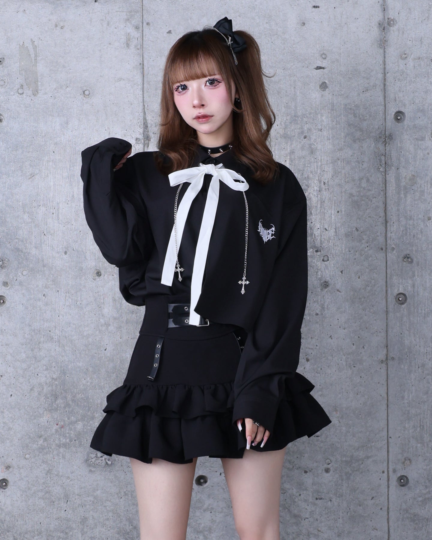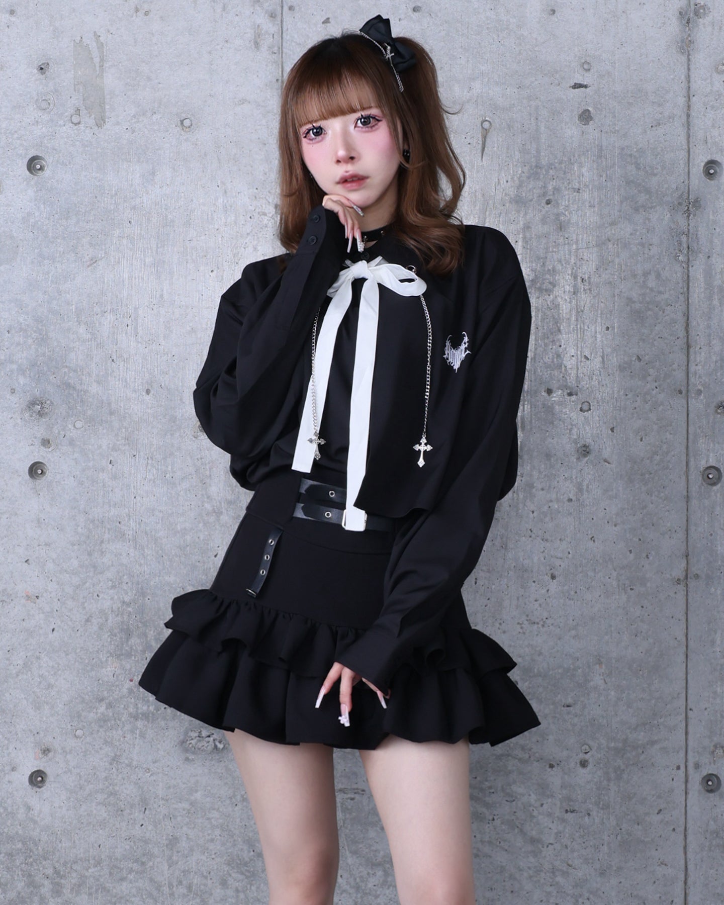 衿にシルバークロス付きチェーンクとリボンネクタイ付きシャツ。