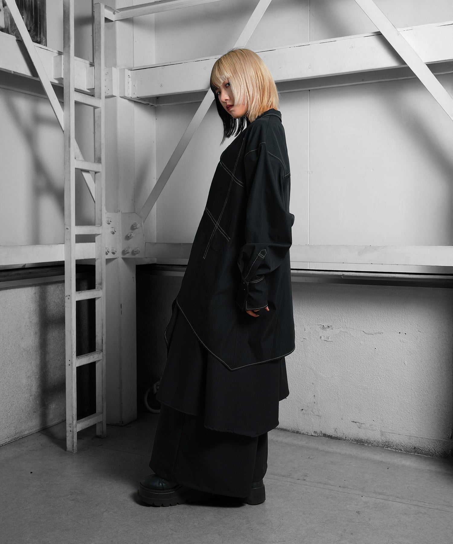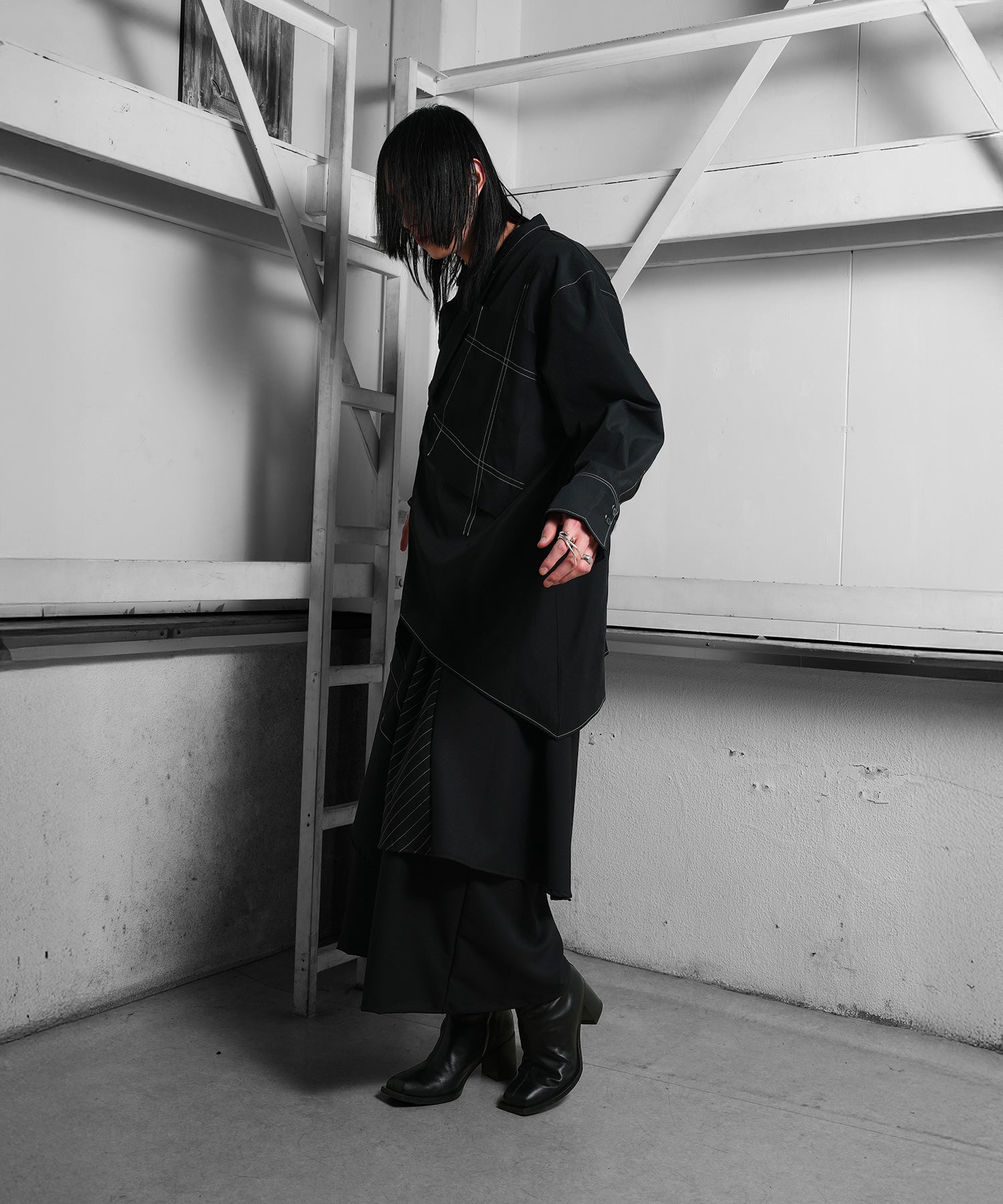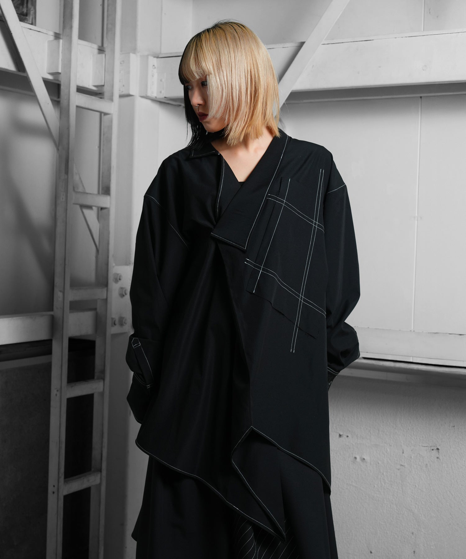 さらに白のステッチは全身黒のスタイルにもカジュアルなスタイルにも合わせることができる。