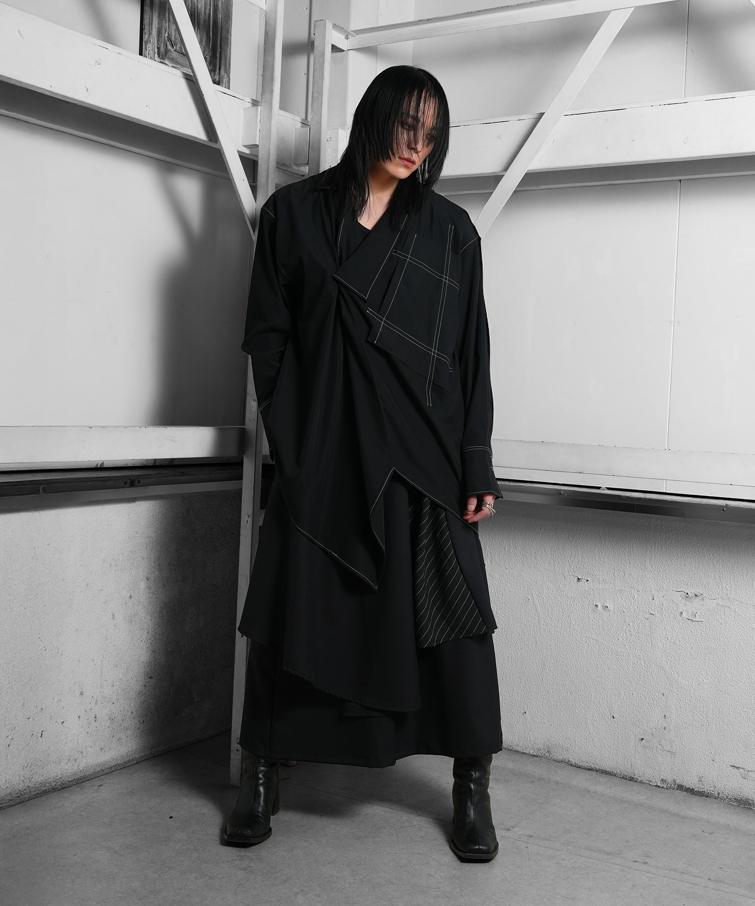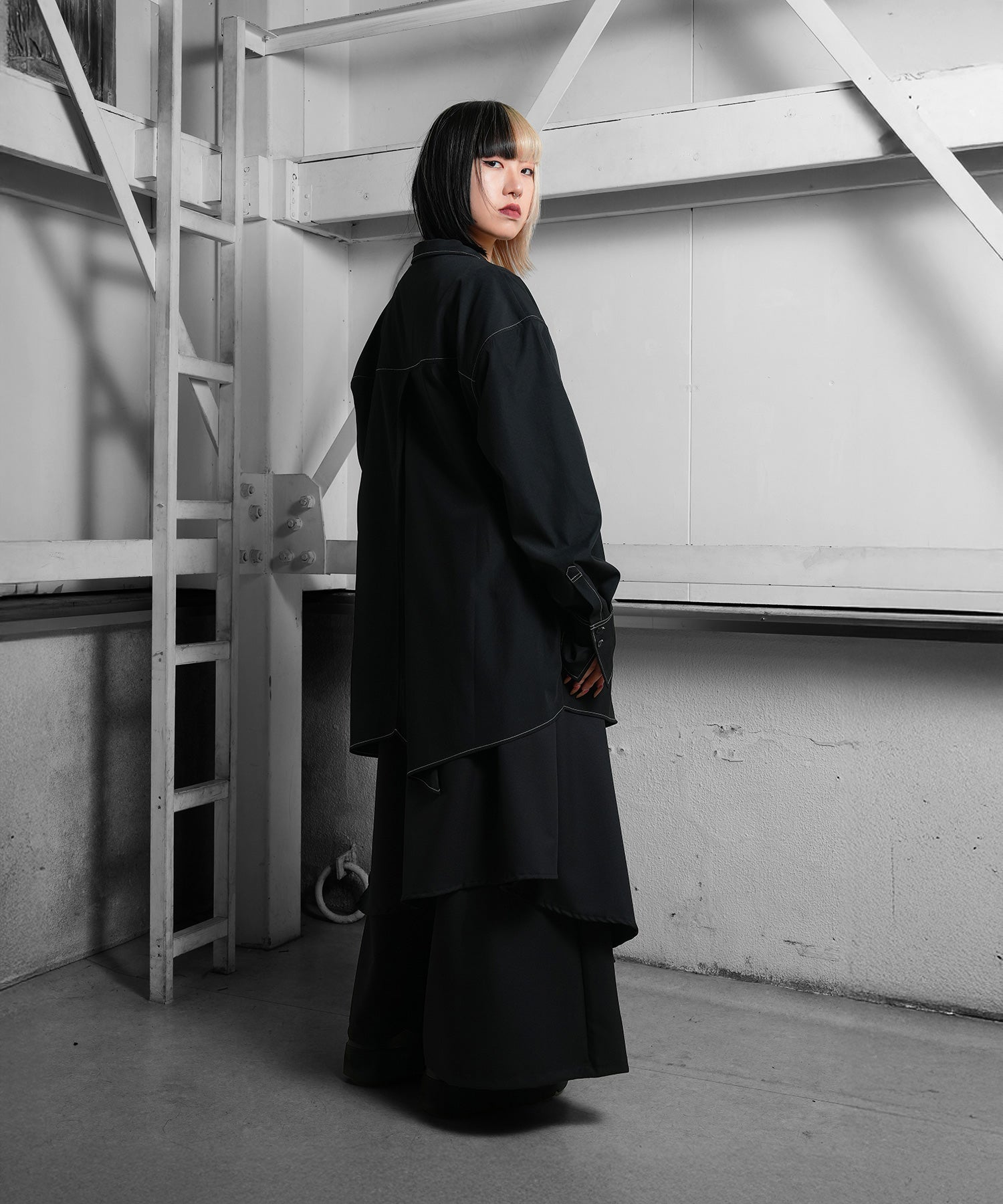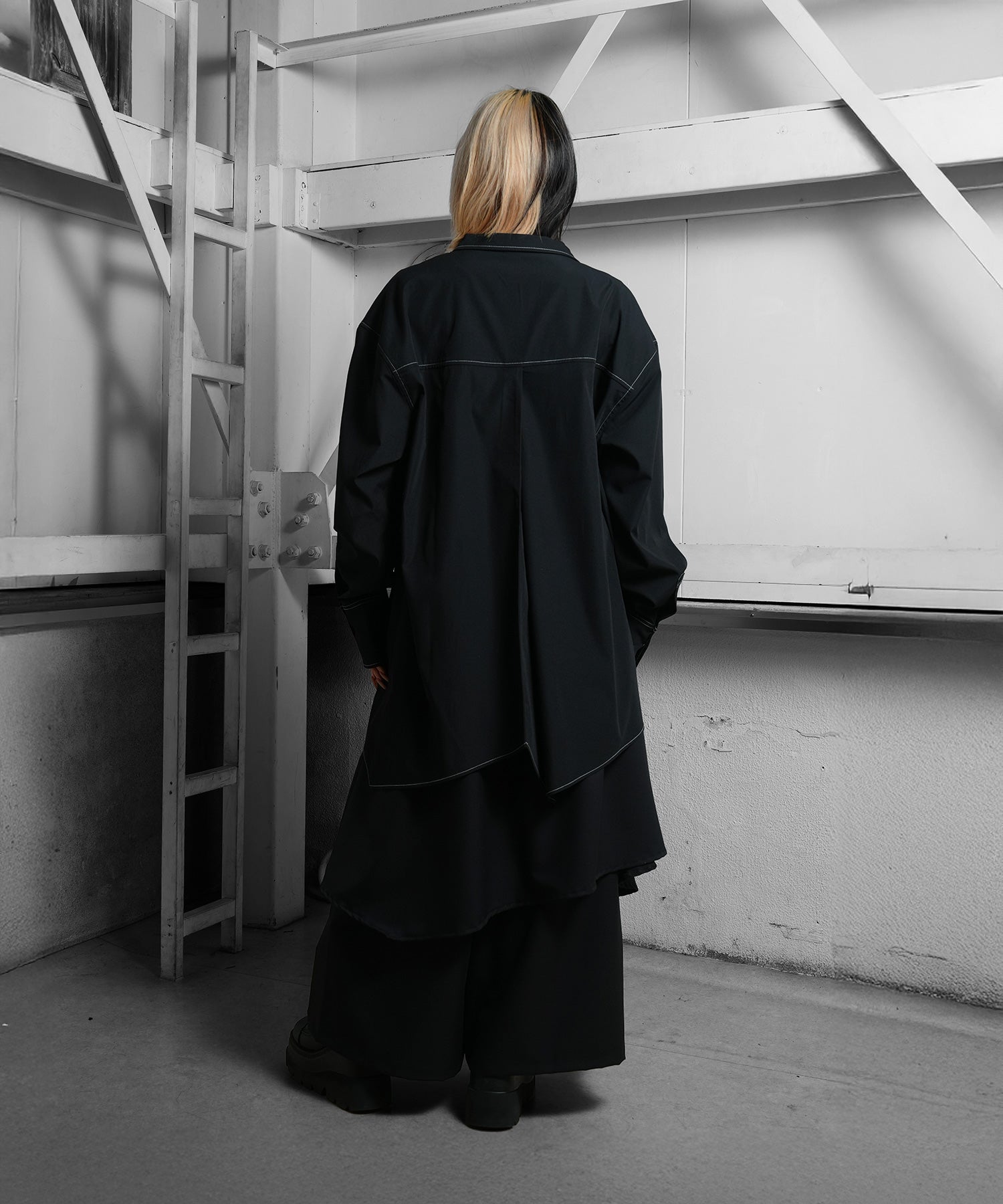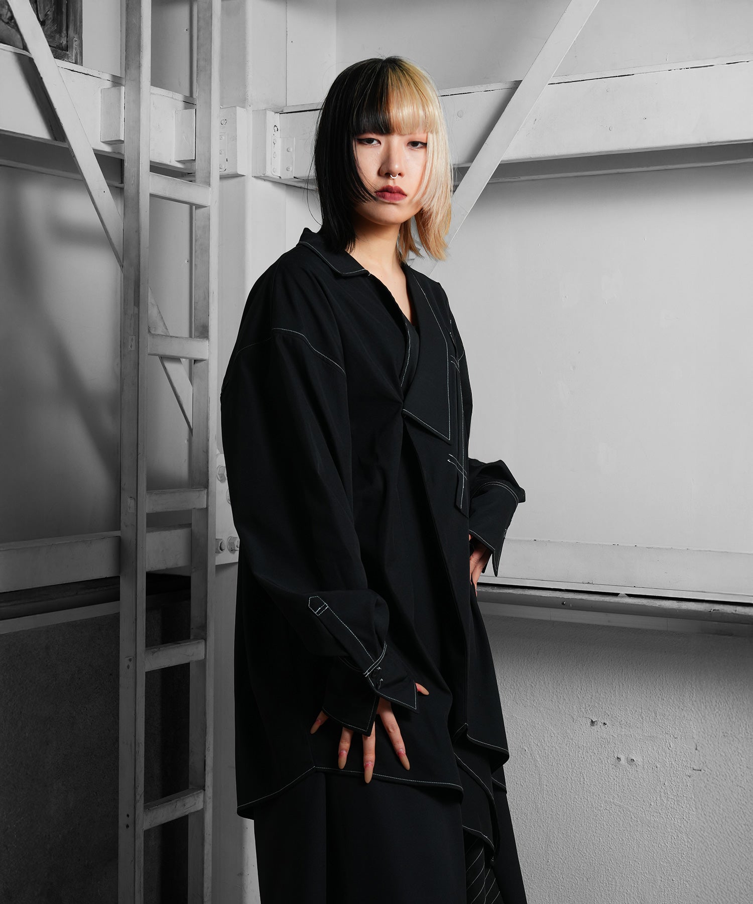 さらに白のステッチは全身黒のスタイルにもカジュアルなスタイルにも合わせることができる。