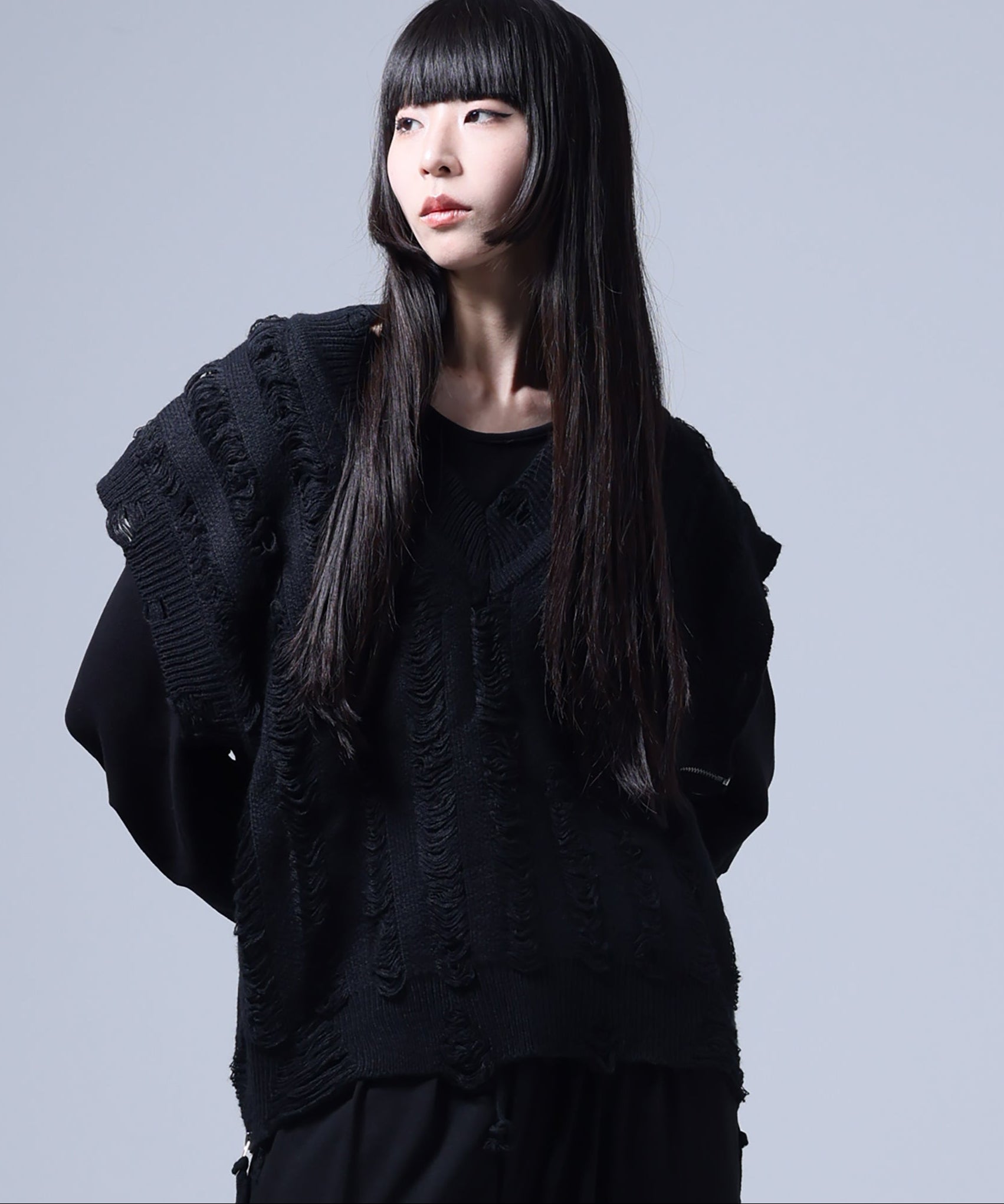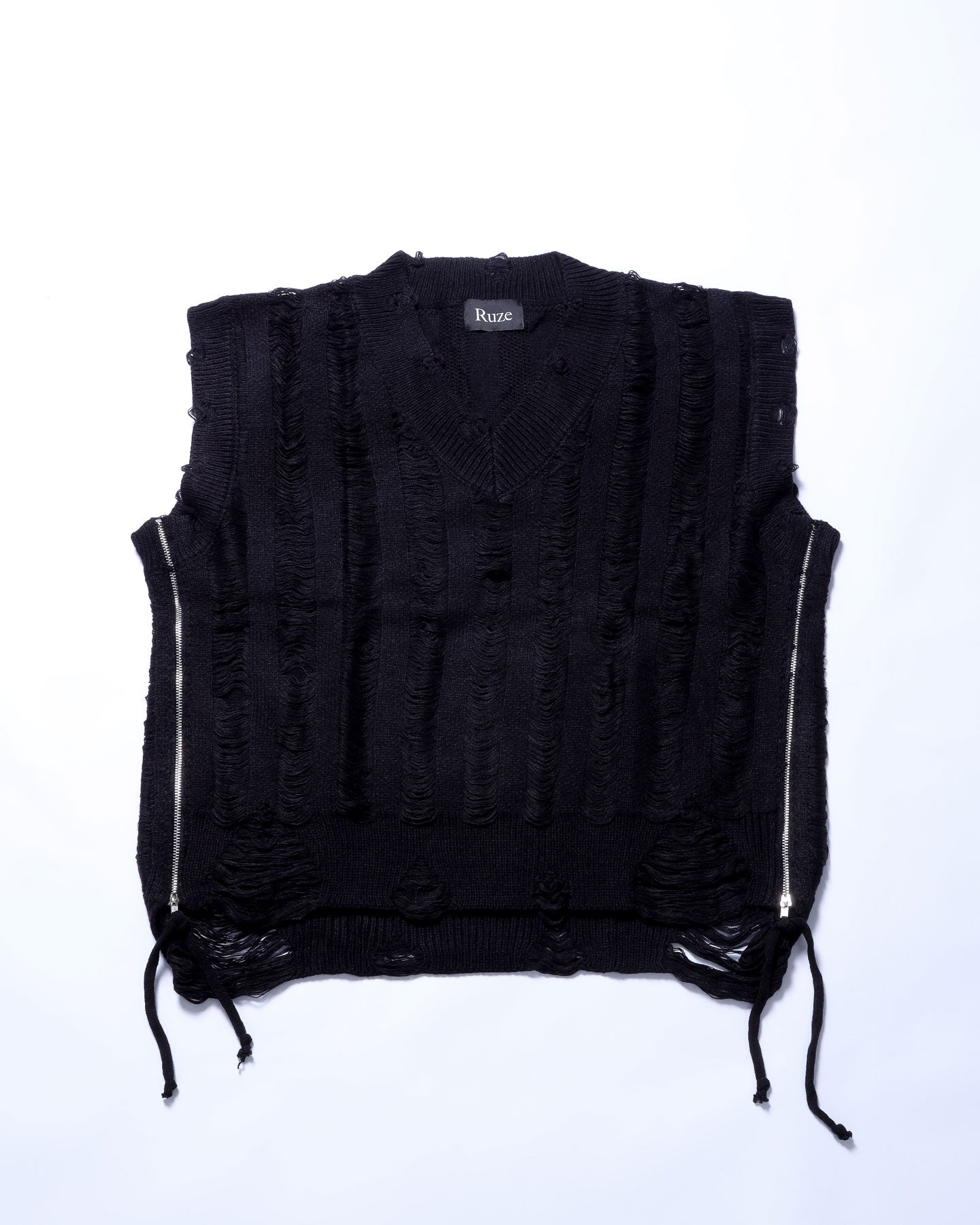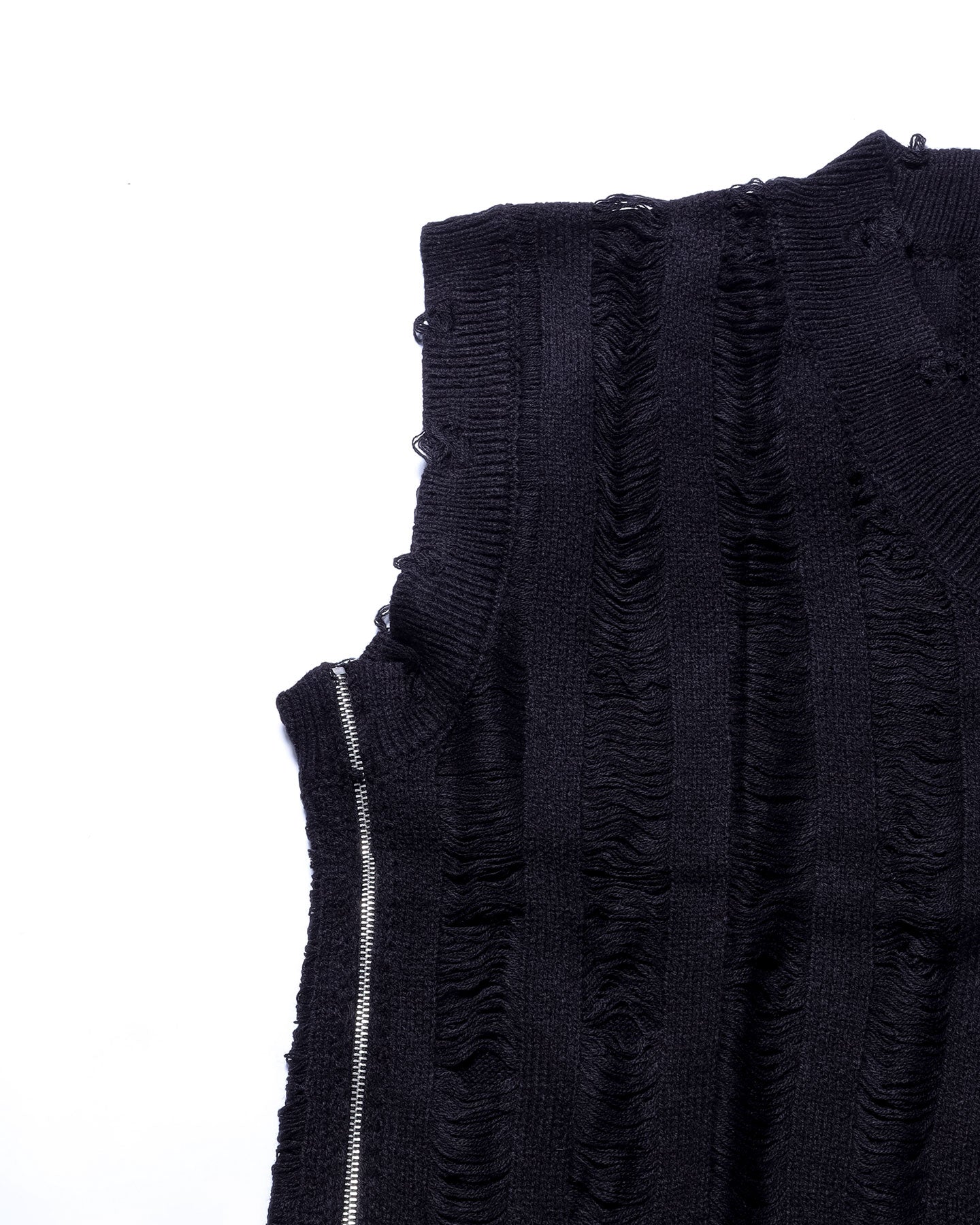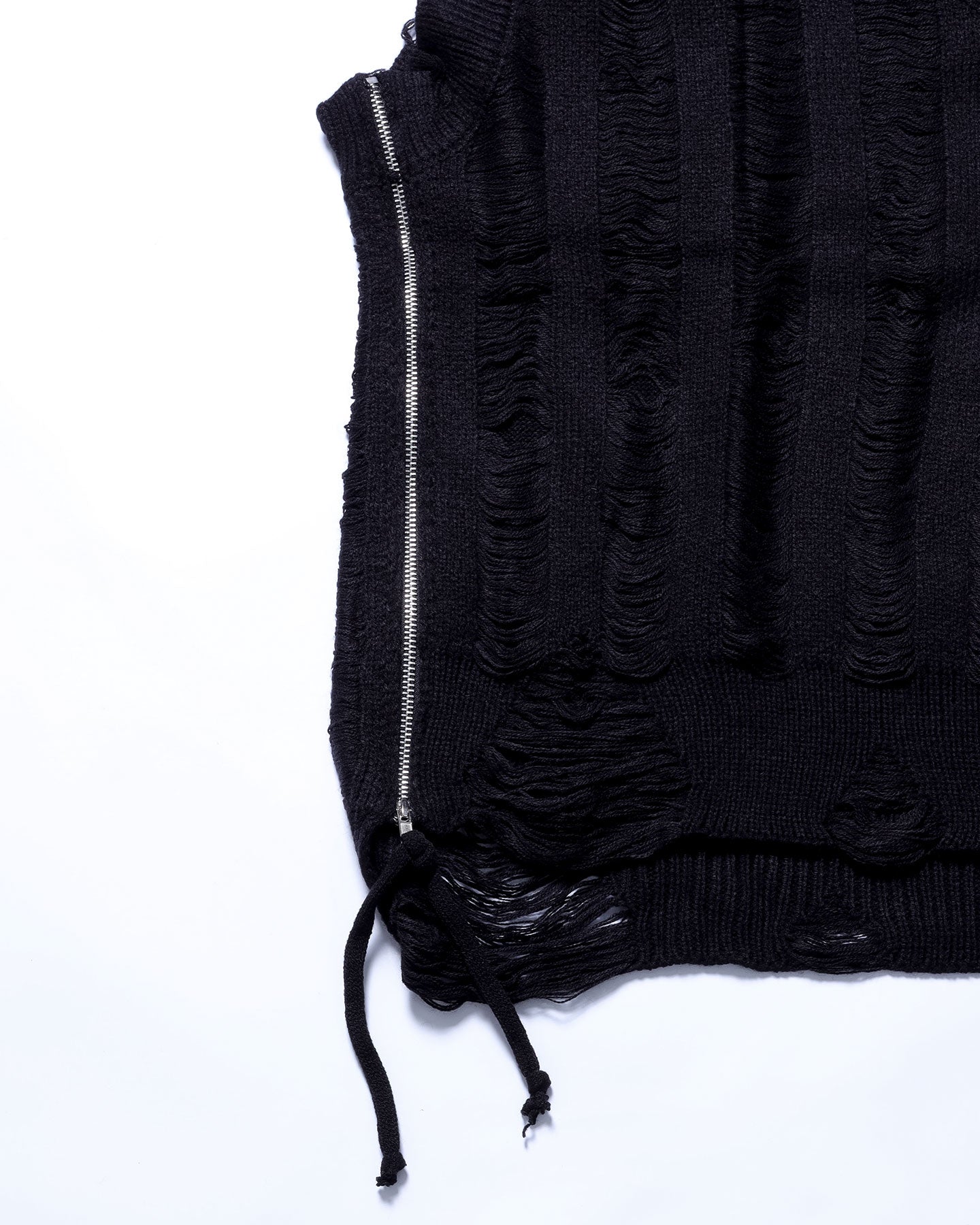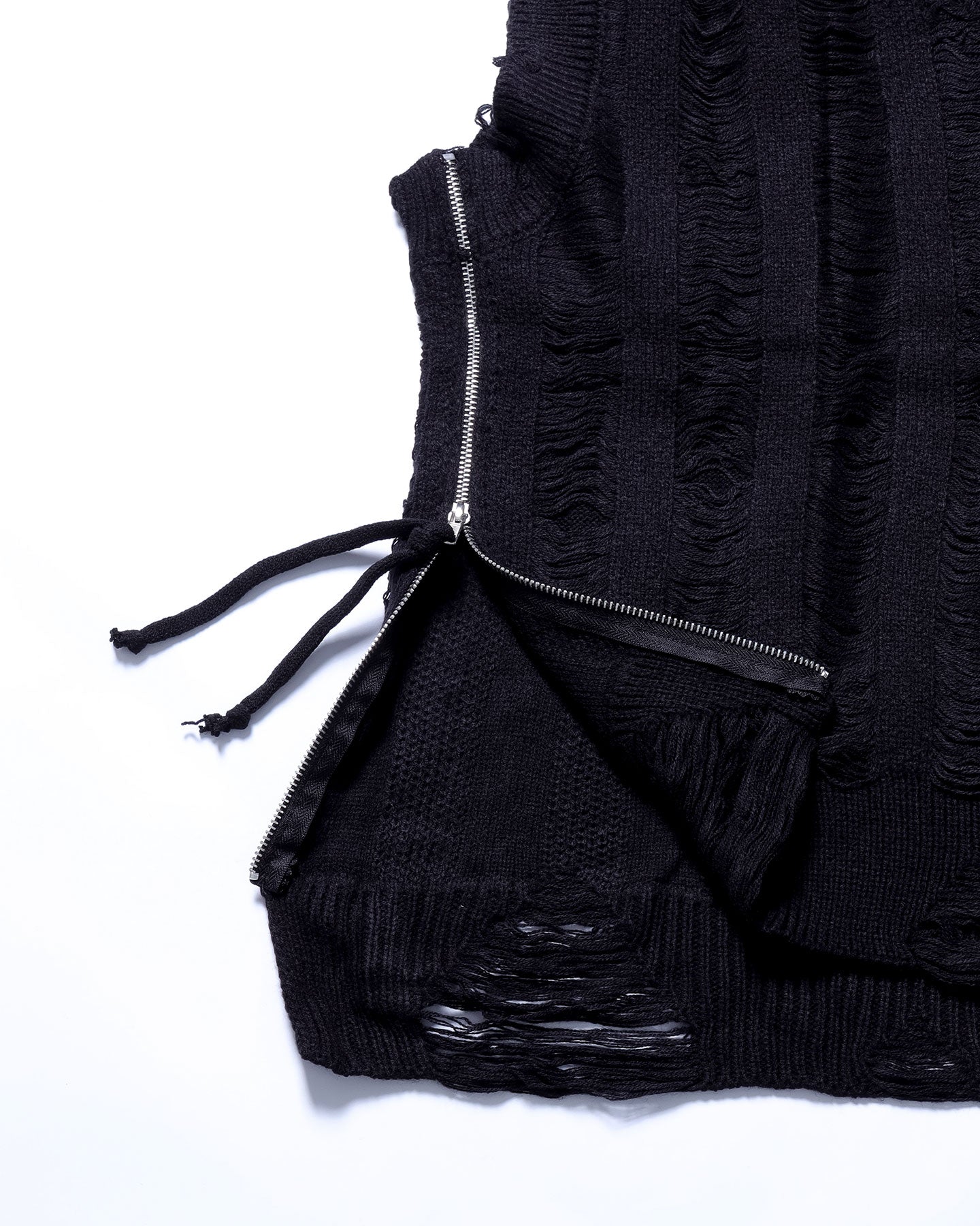 全面にダメージ加工を施し、さらに両サイドにジップを配したニットベスト。
