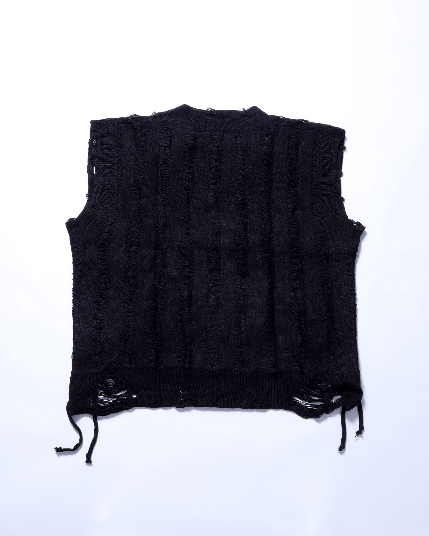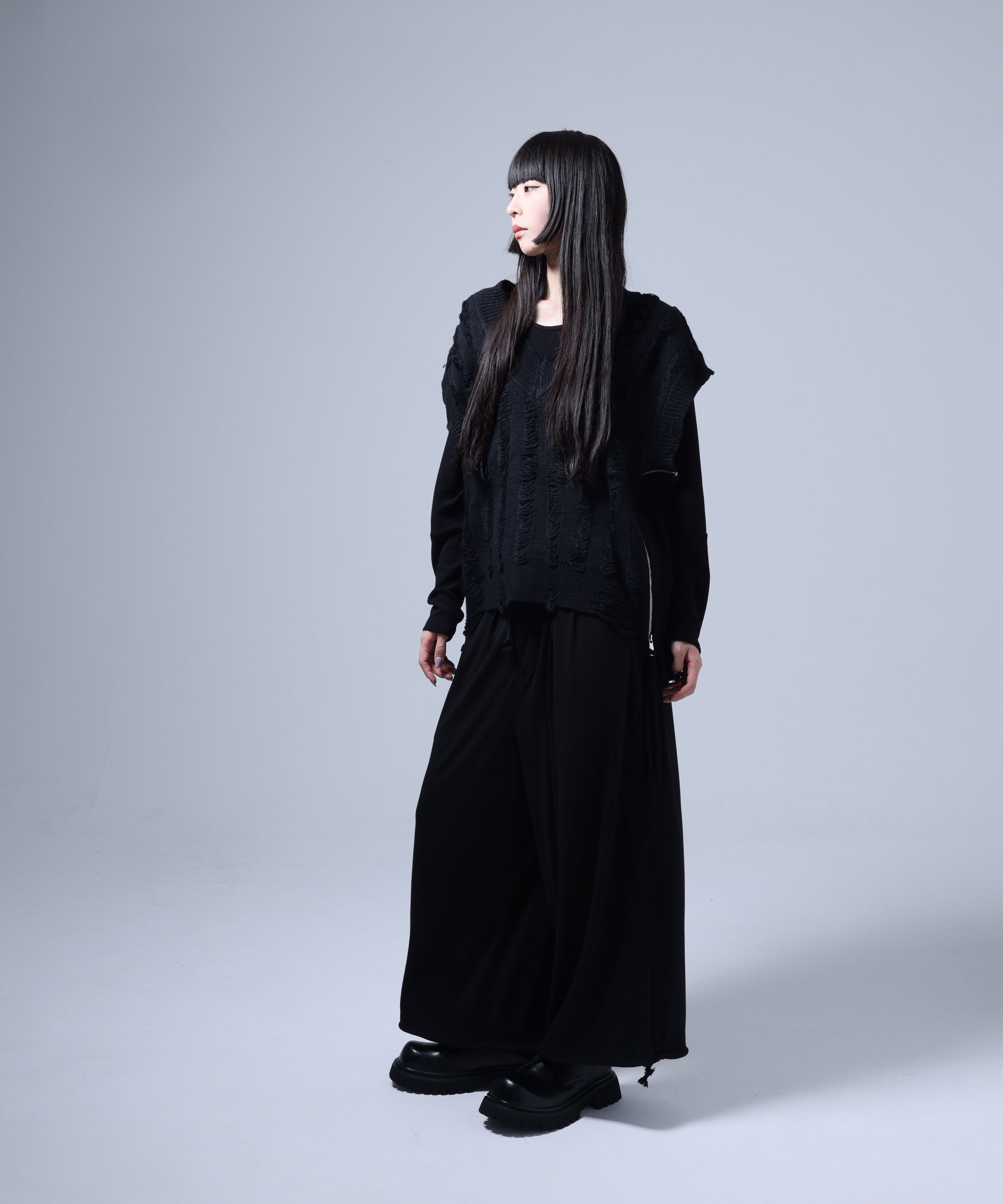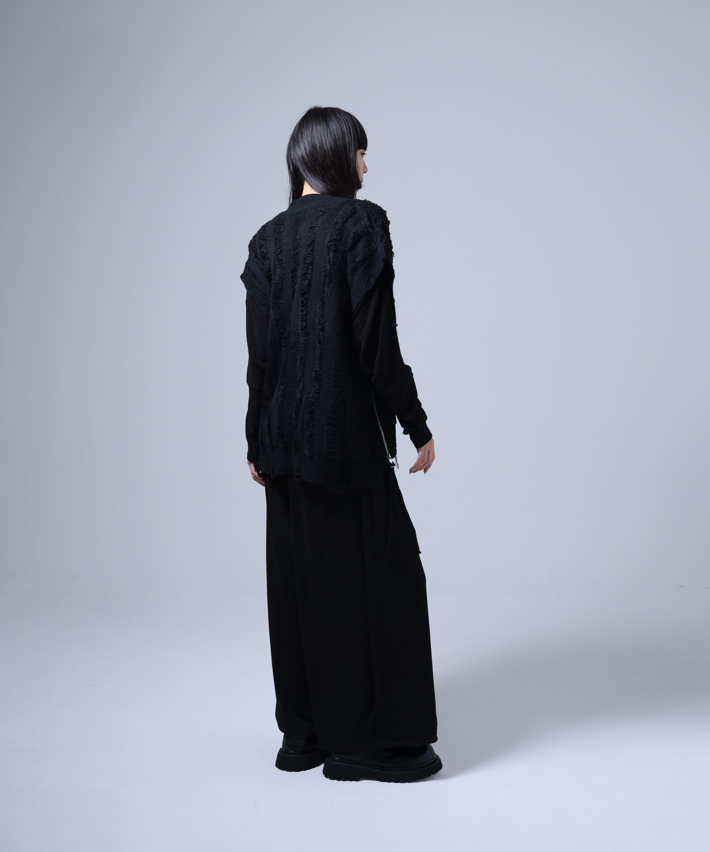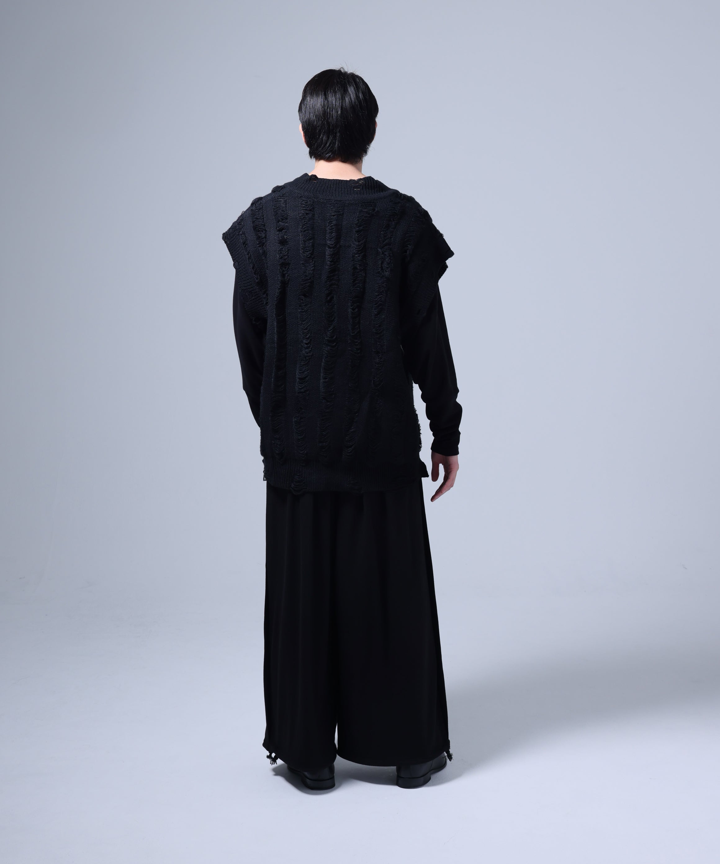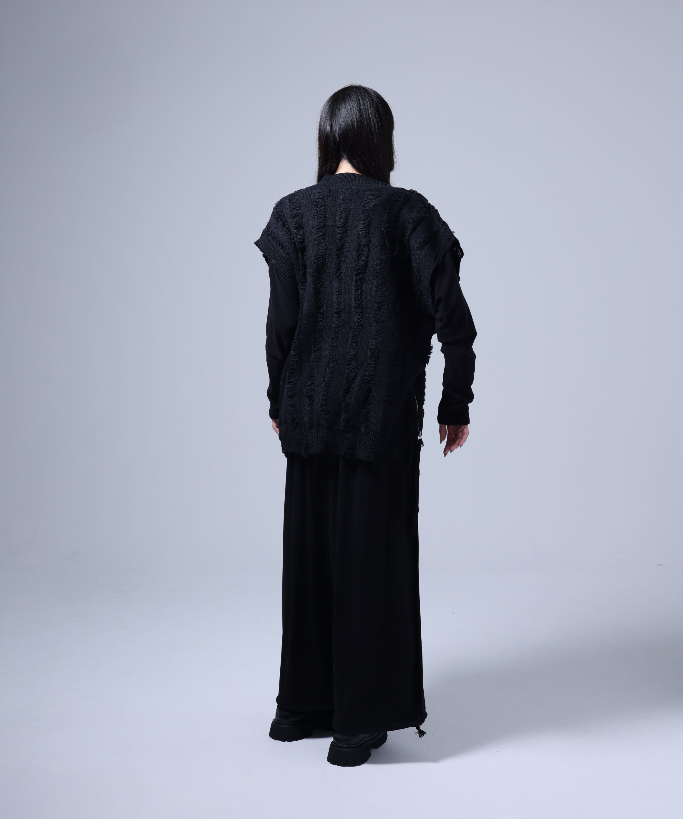 全面にダメージ加工を施し、さらに両サイドにジップを配したニットベスト。