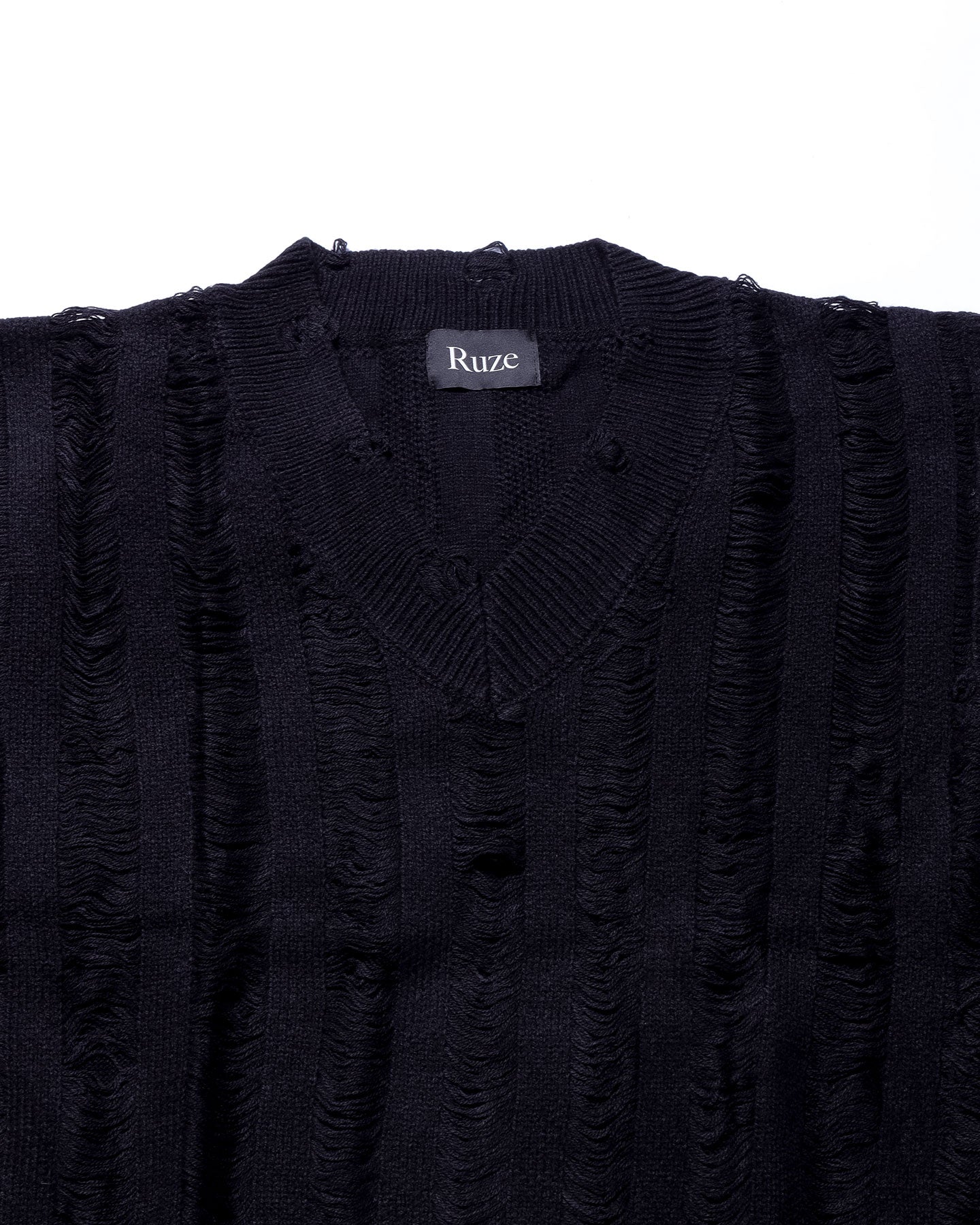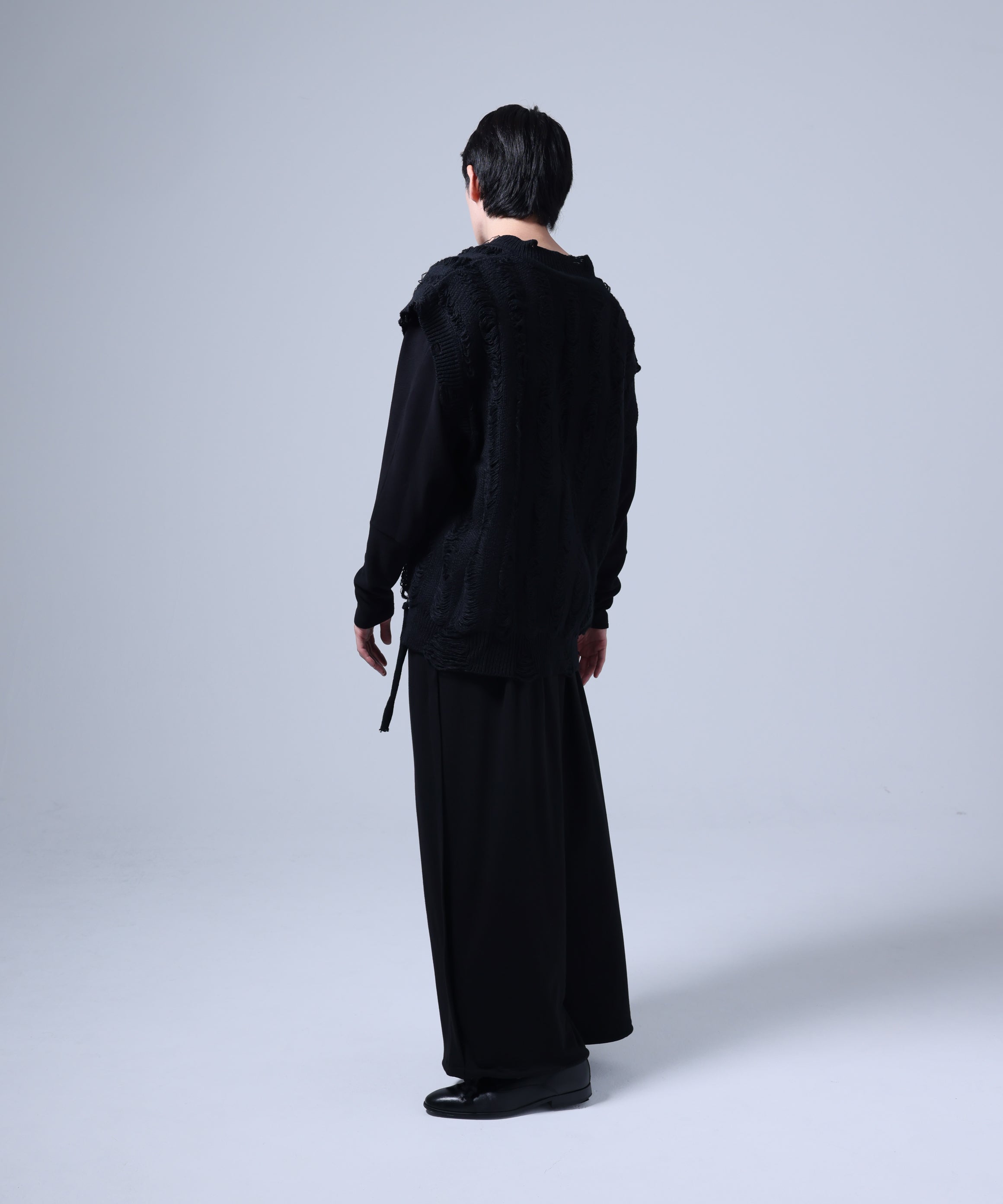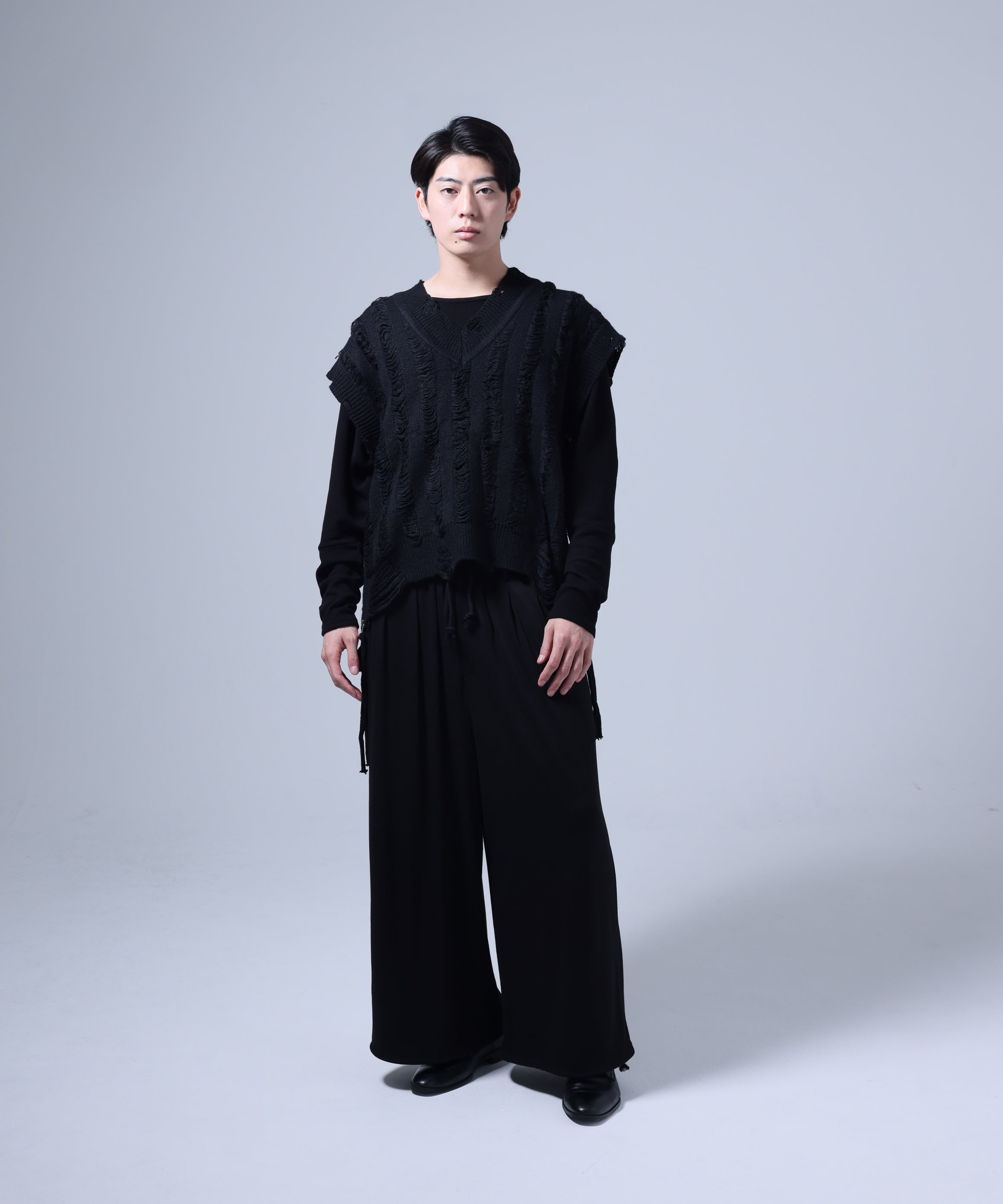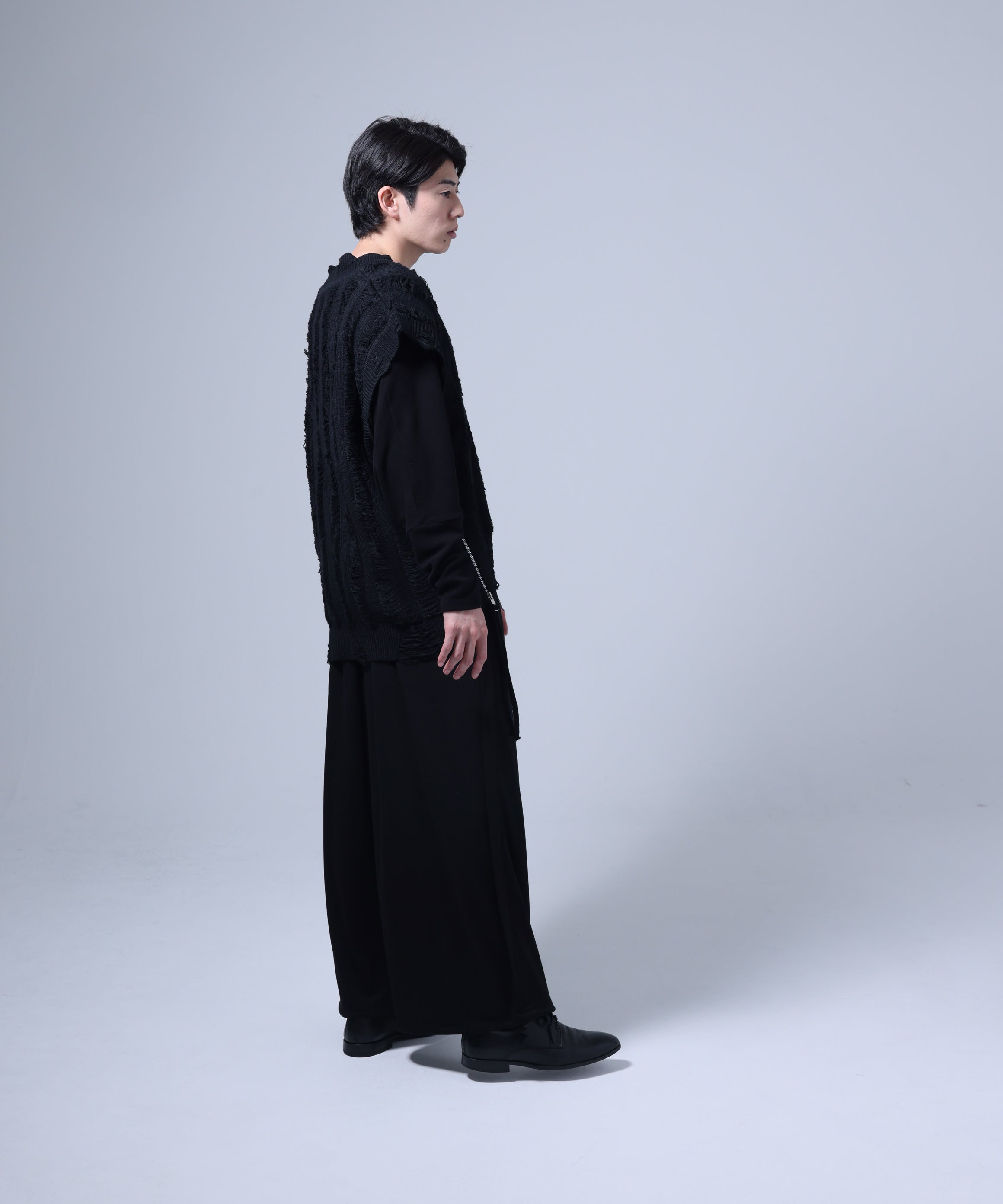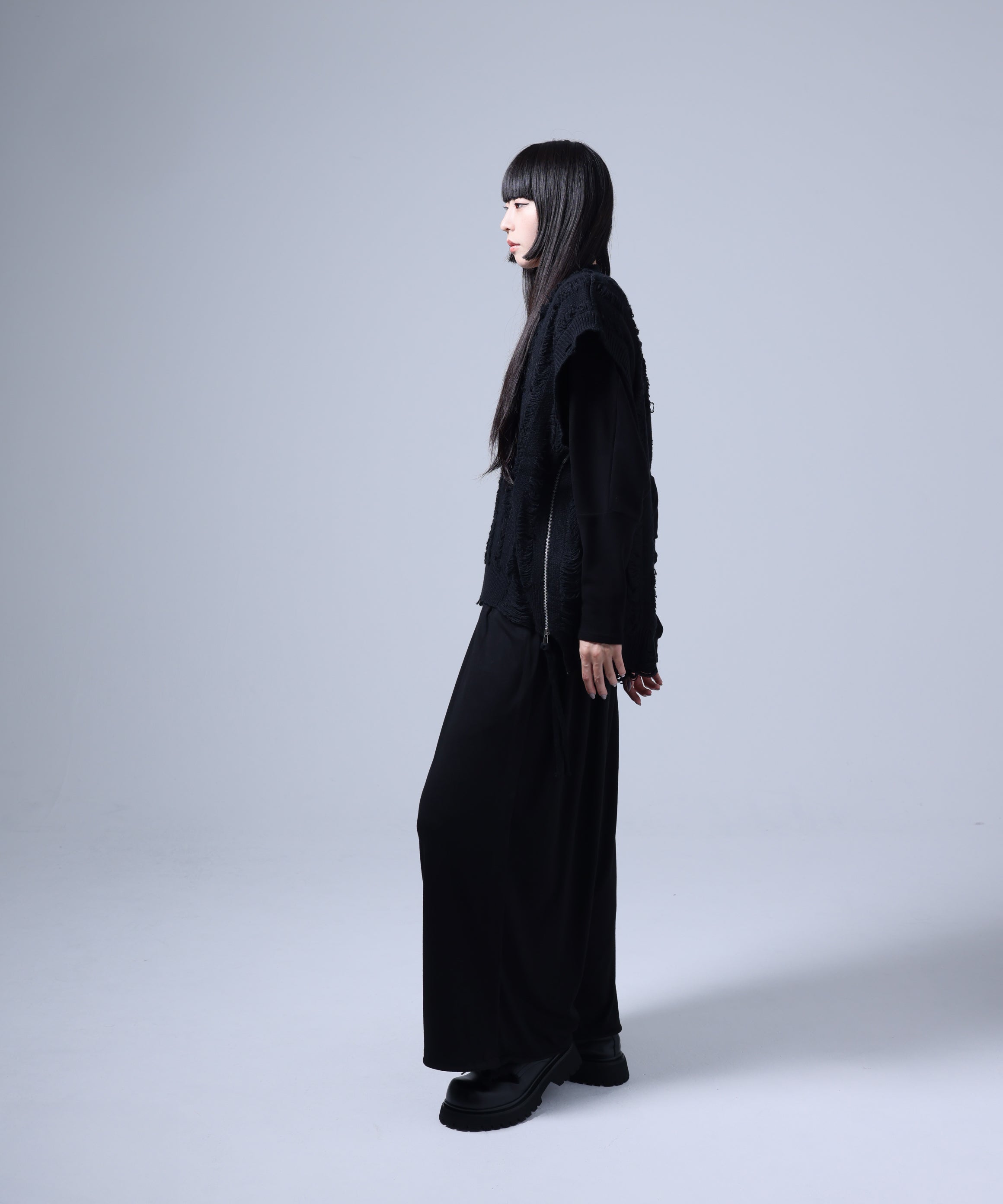 全面にダメージ加工を施し、さらに両サイドにジップを配したニットベスト。