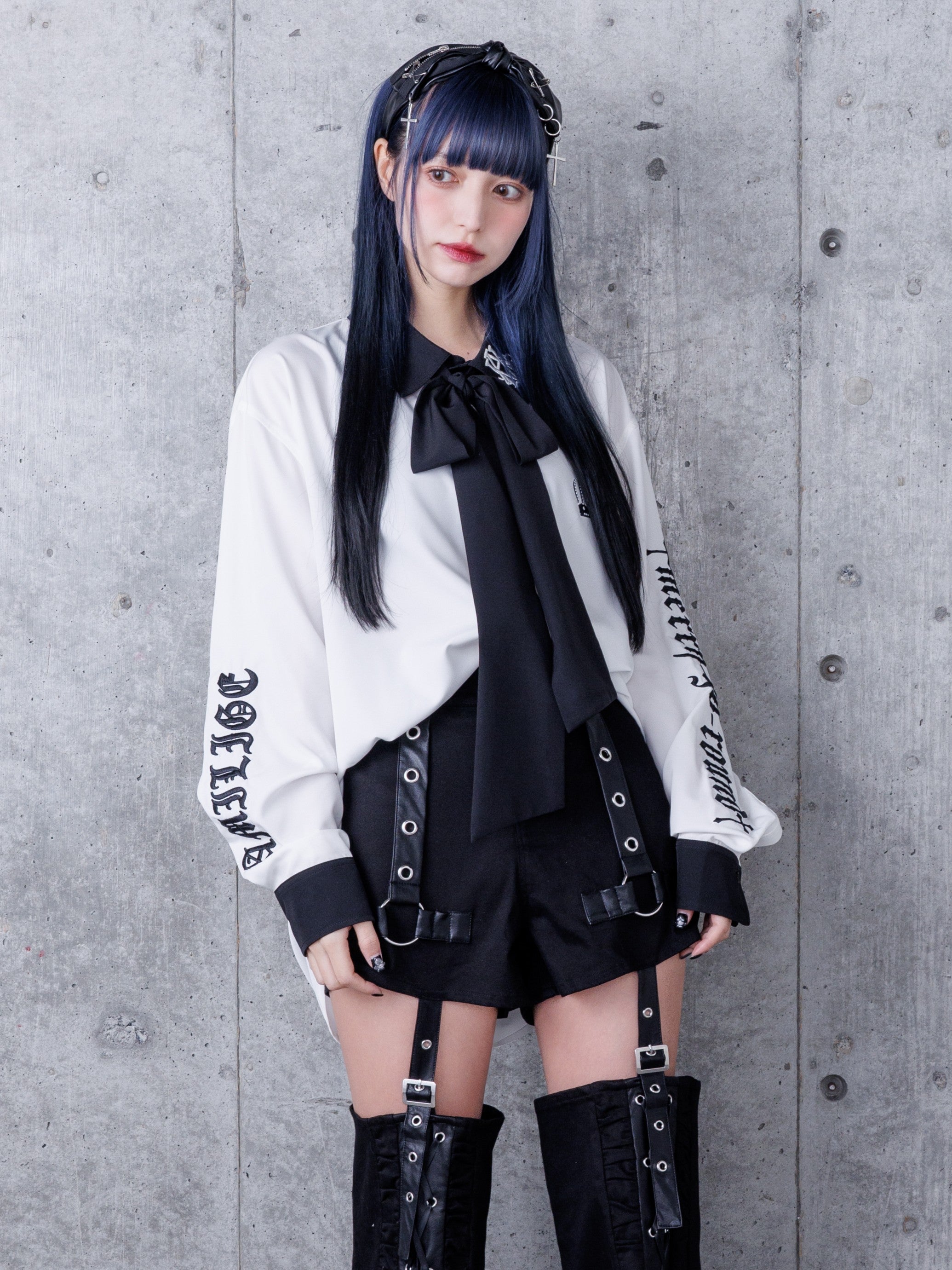 衿にシルバークロス付きチェーンクとリボンネクタイ付きシャツ。