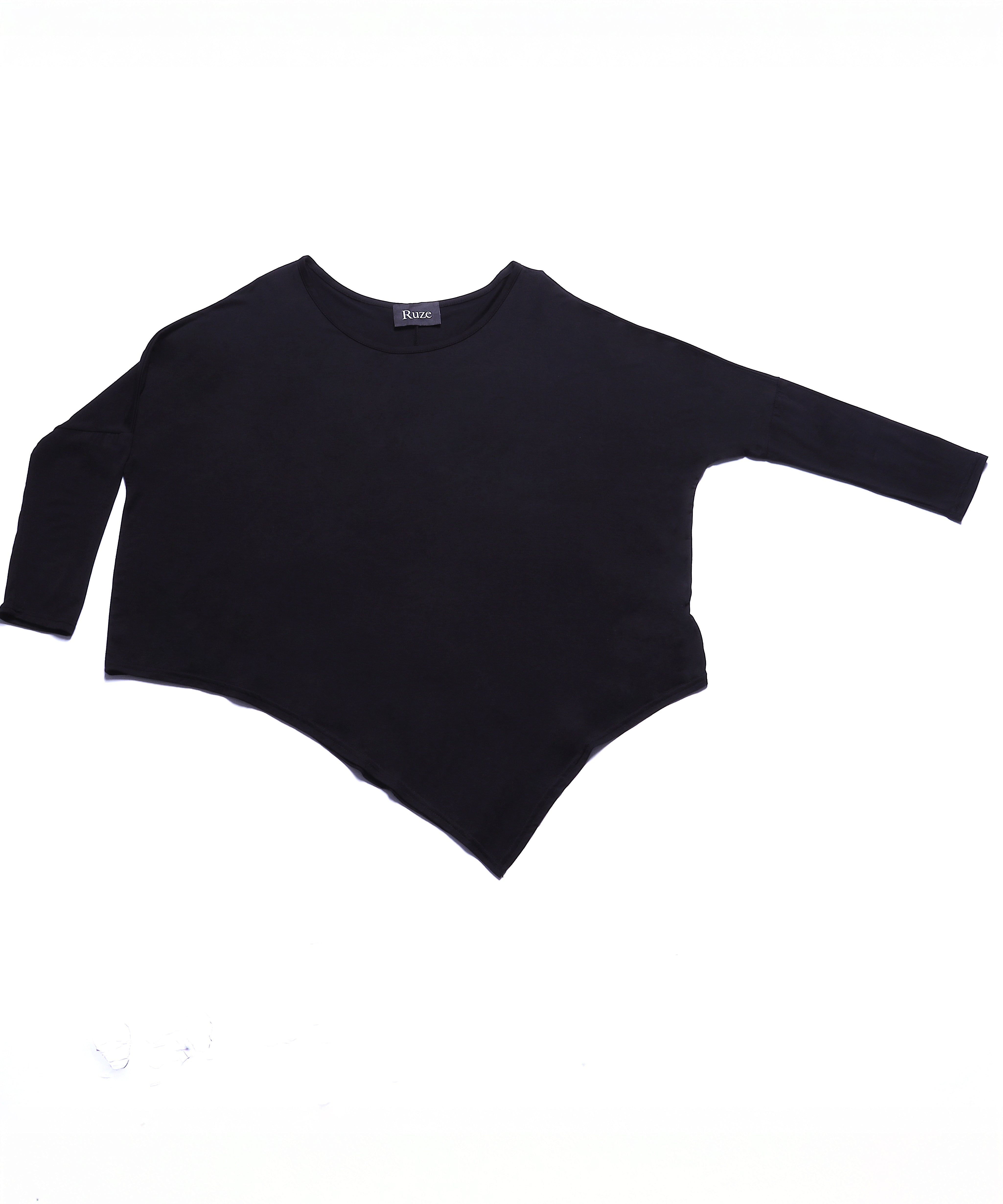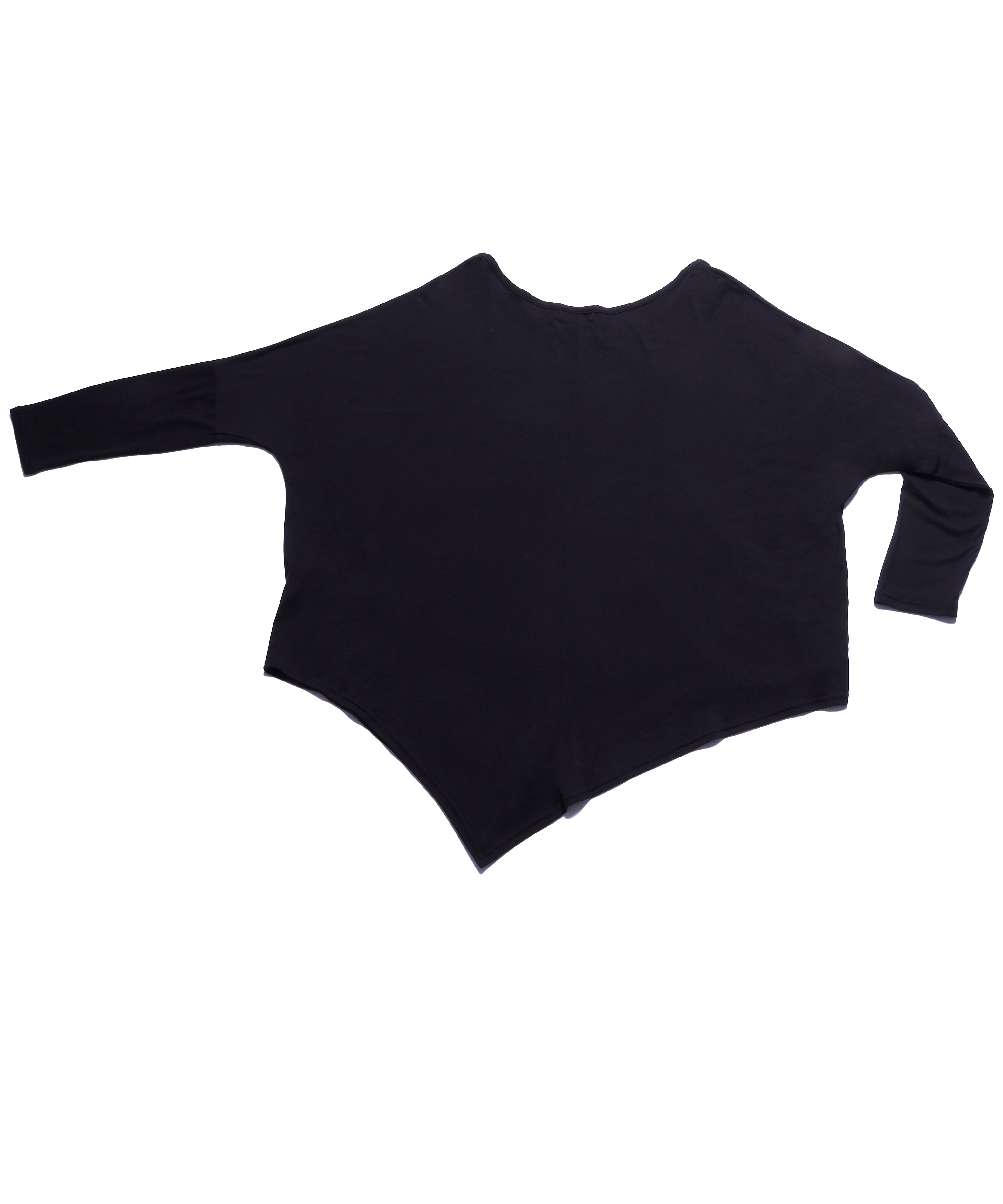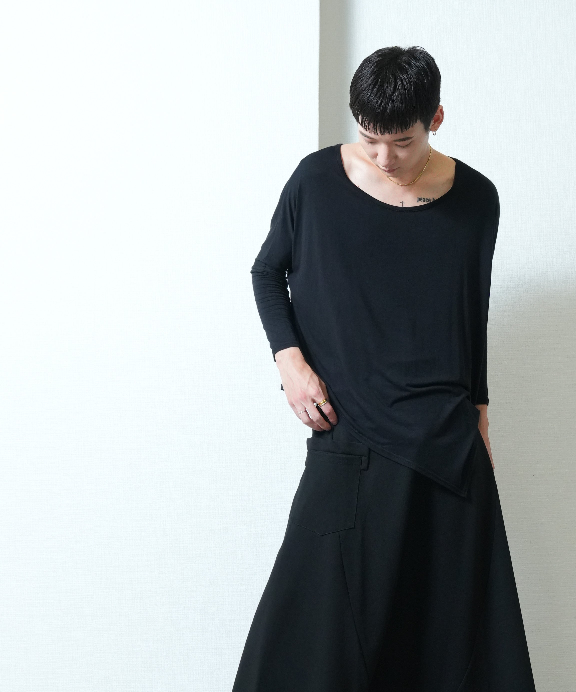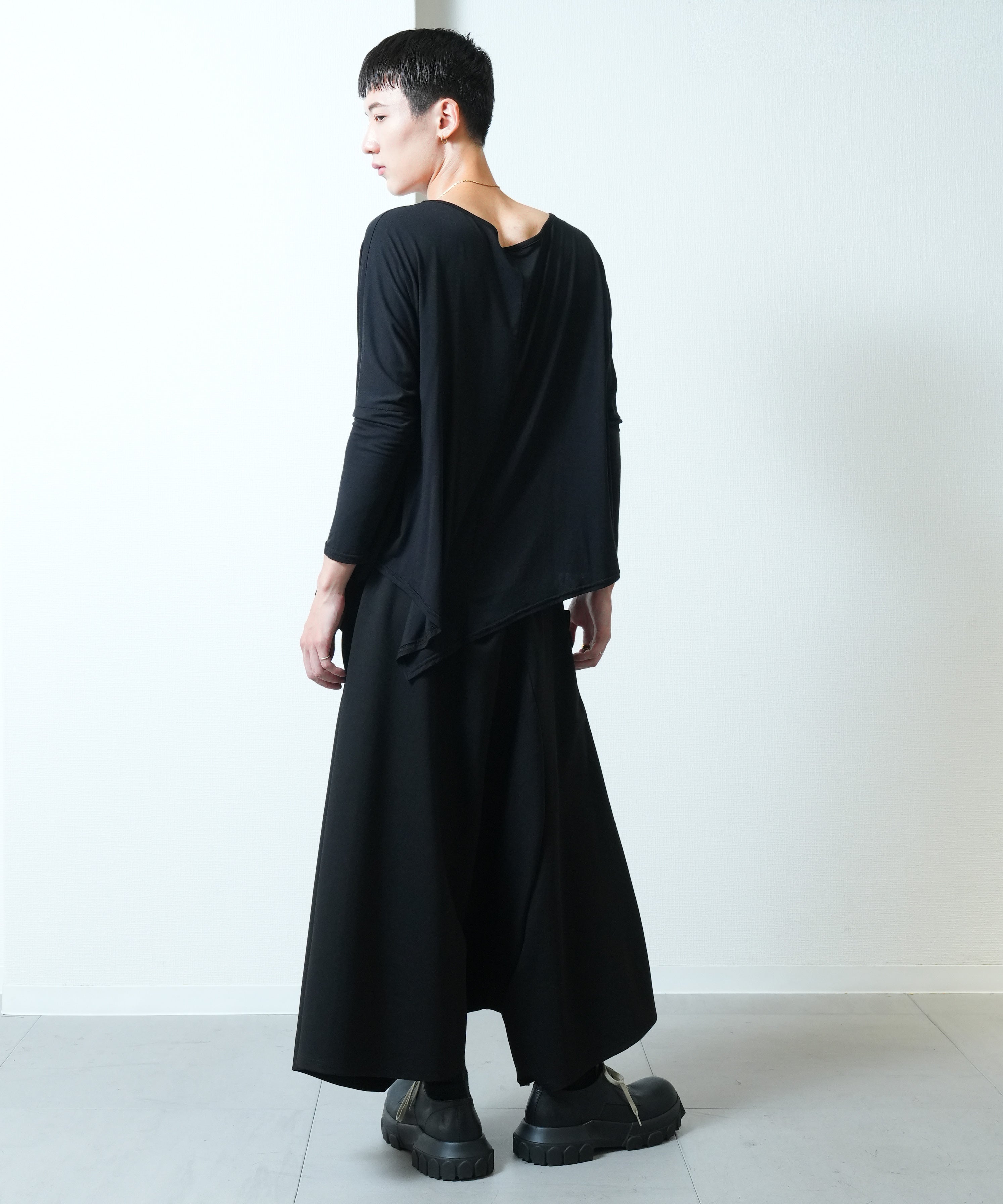 極端に大きく取られた身幅と肩幅、流れるようなヘムラインのアシンメトリーデザインは動きに合わせて表情を変える。