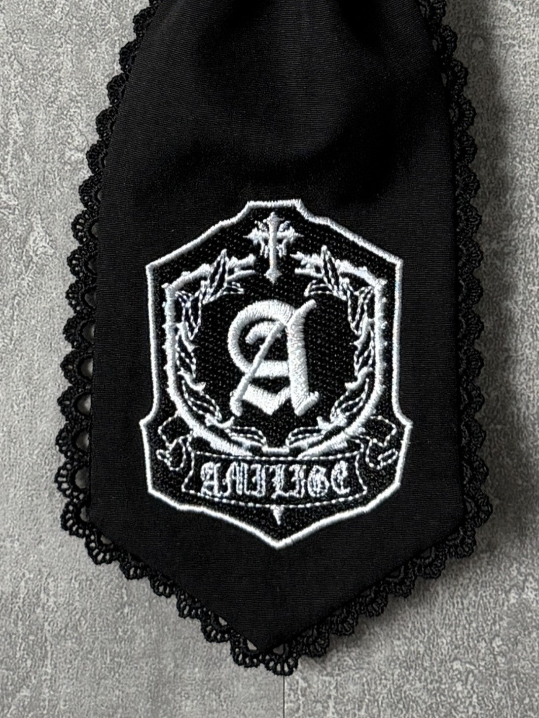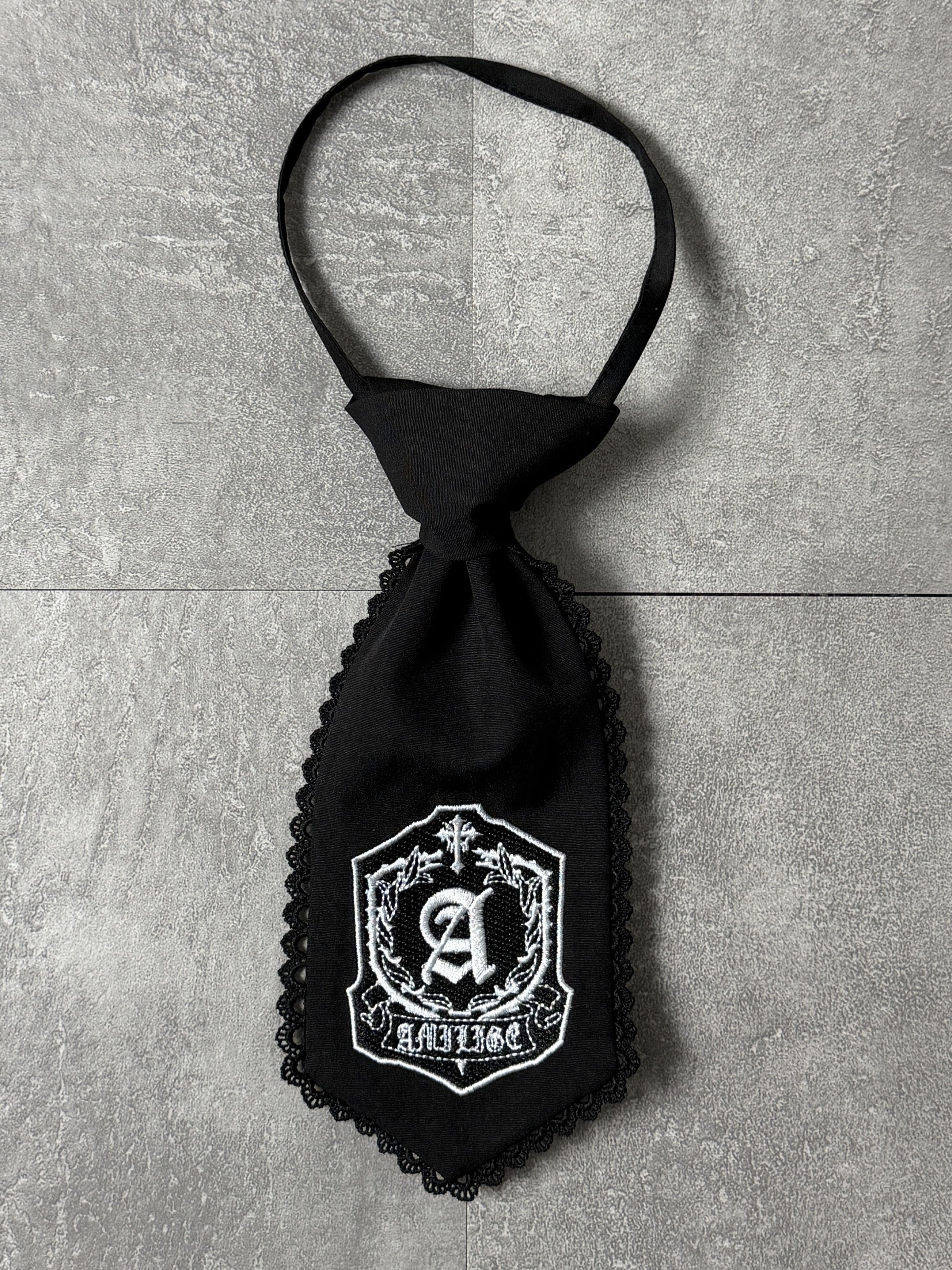 シルバーのリングとクールなクロス刺繍が目を引く、リングクロス刺繍ネクタイ。